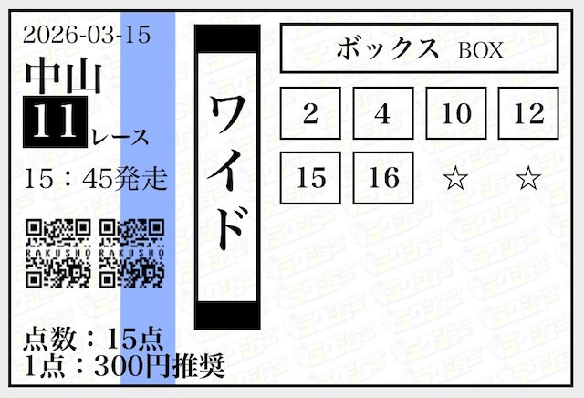 4.0匿名さん30代 男性 職業:◎良い点ワイドが1番良さそういろいろな券種で予想が提供されるけど、1番ワイドが当たる印象。ワイドの予想だけ使っていけば稼いでいける気がする。 - 2026.02.10