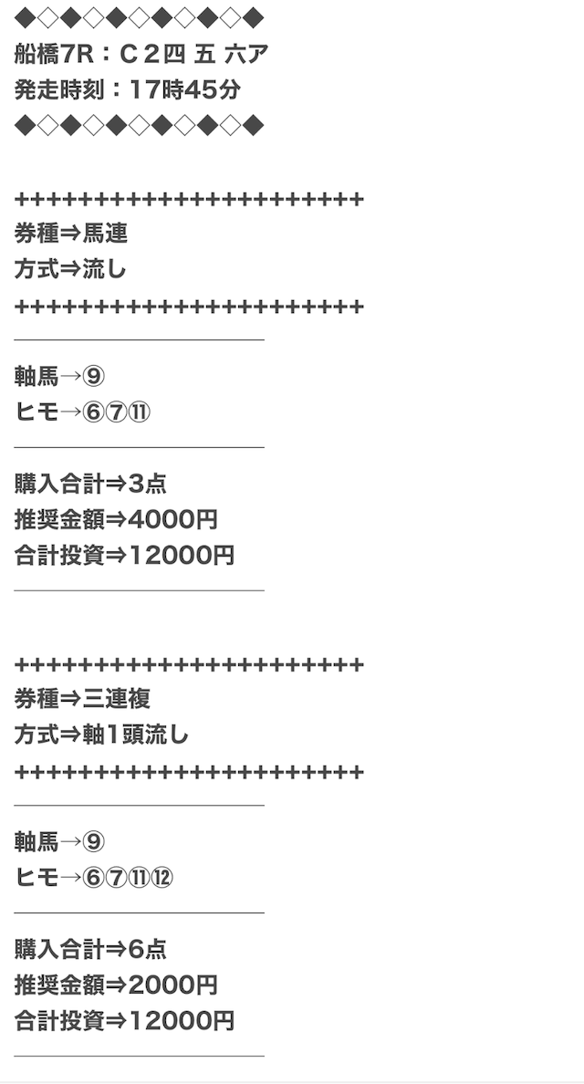 3.0匿名さん30代 男性 職業:✕ 悪い点馬券代が少し高い1万2千円は少し高い。いろんな券種で提供しているから馬連くらいの予想の時は1万円くらいの馬券代で参加できるような買い目を提供して欲しい。 - 2025.03.25