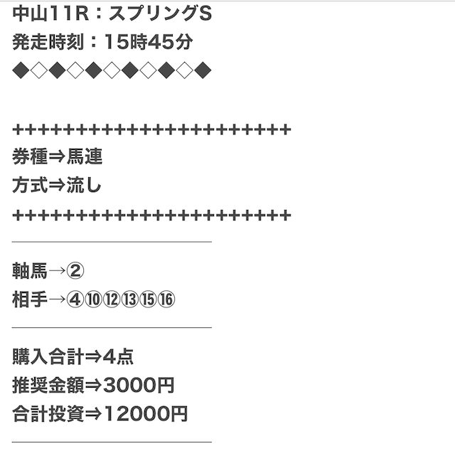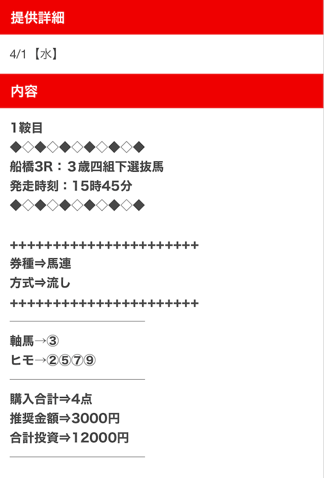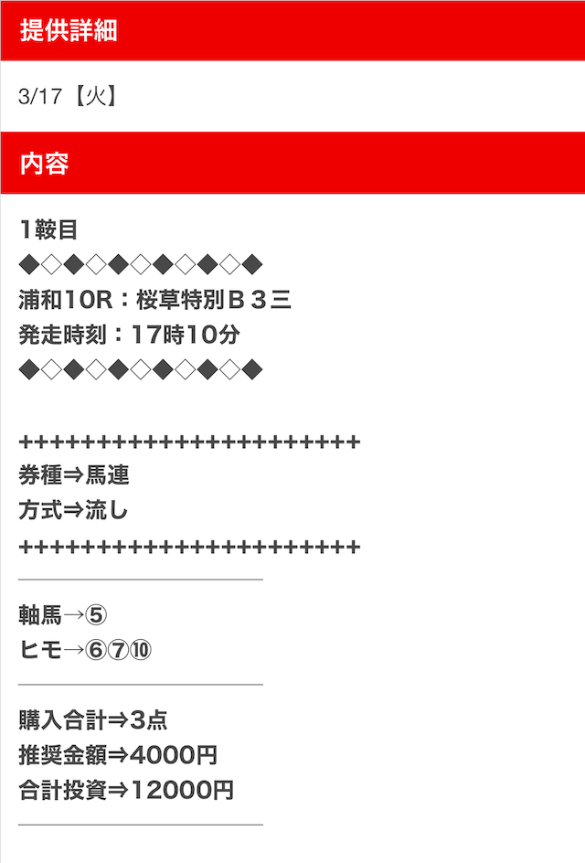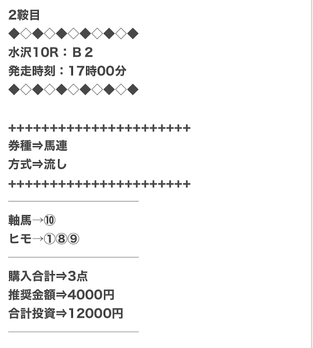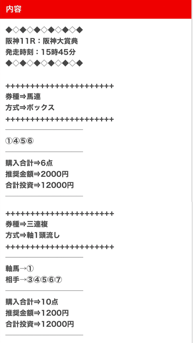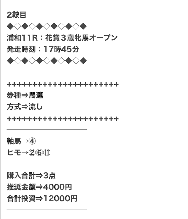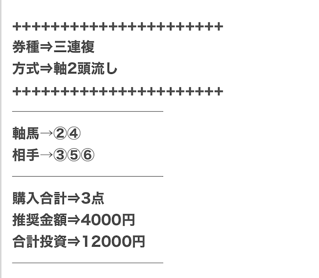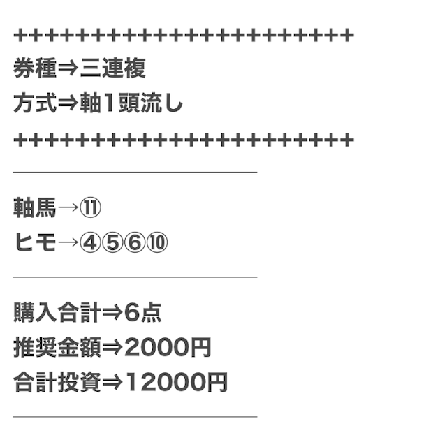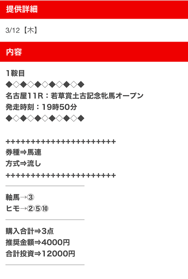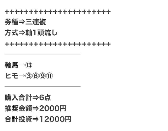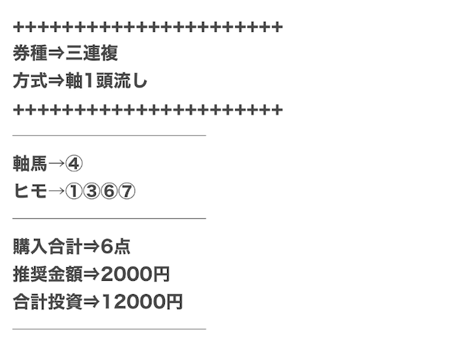3.0匿名さん30代 男性 職業:✕ 悪い点馬券代が少し高い1万2千円は少し高い。いろんな券種で提供しているから馬連くらいの予想の時は1万円くらいの馬券代で参加できるような買い目を提供して欲しい。