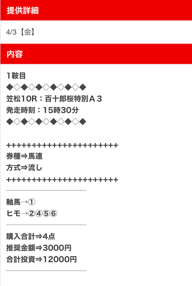 3.0名無しさん30代 男性 職業:✕ 悪い点点数削り過ぎな気がする馬連でも4点は攻め過ぎじゃないかな。当たっているからいいけども、使っている身としては保険の買い目を入れて安定性を重視して欲しいところがある。 - 2025.03.26