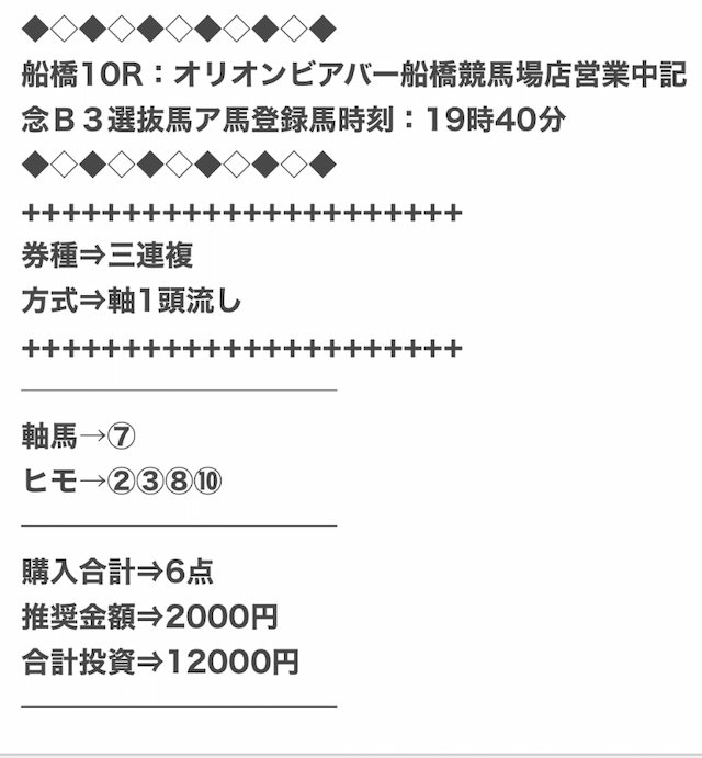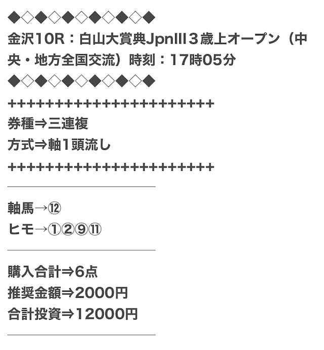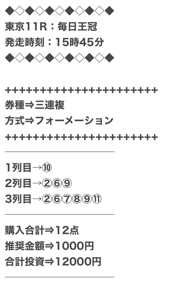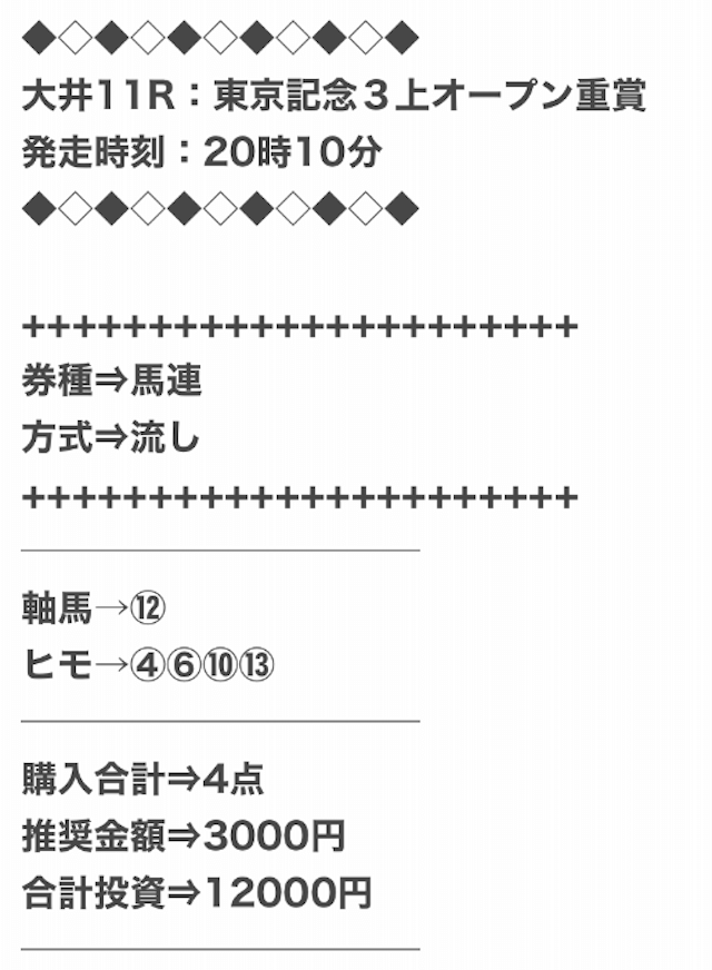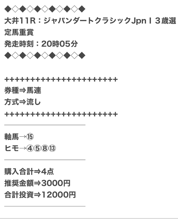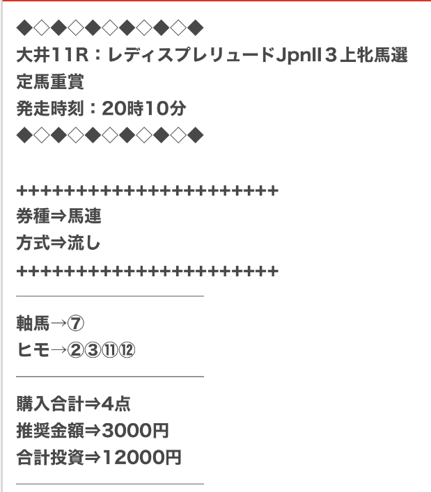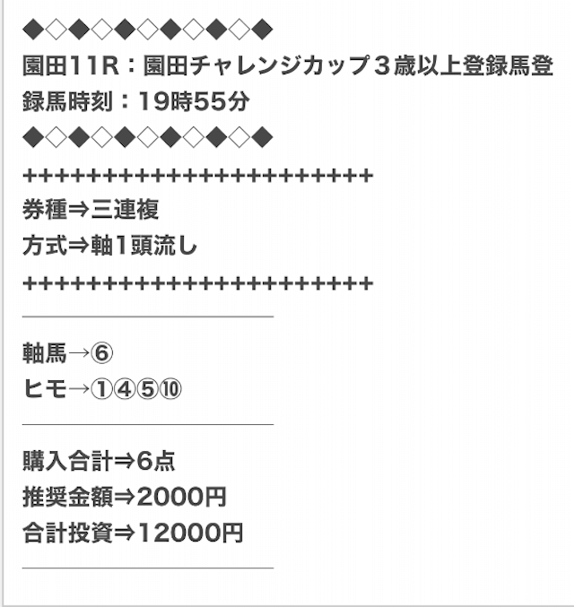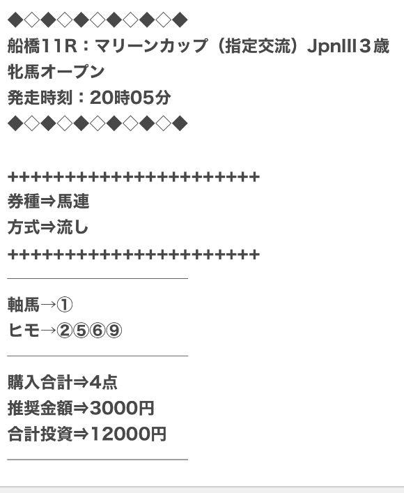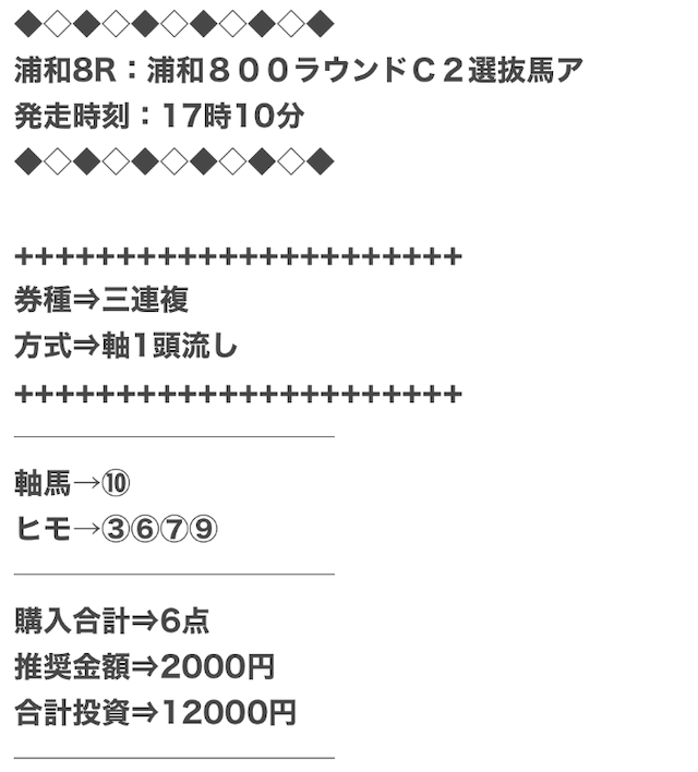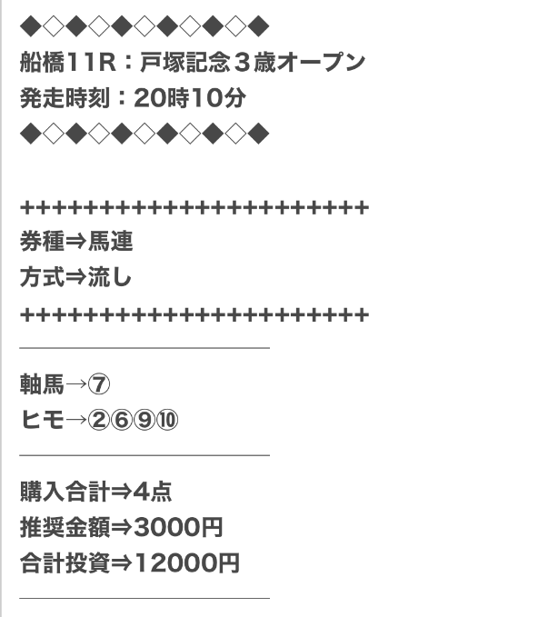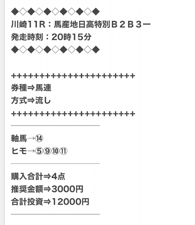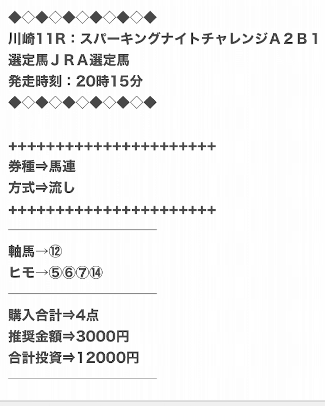 - 2025.03.263.0匿名さん30代 男性 職業:✕ 悪い点馬券代が少し高い1万2千円は少し高い。いろんな券種で提供しているから馬連くらいの予想の時は1万円くらいの馬券代で参加できるような買い目を提供して欲しい。