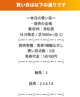 1番人気を3着予想でしか選ばないことが少し気になりはするが、直近の成績を考えればまだ分かる範疇。