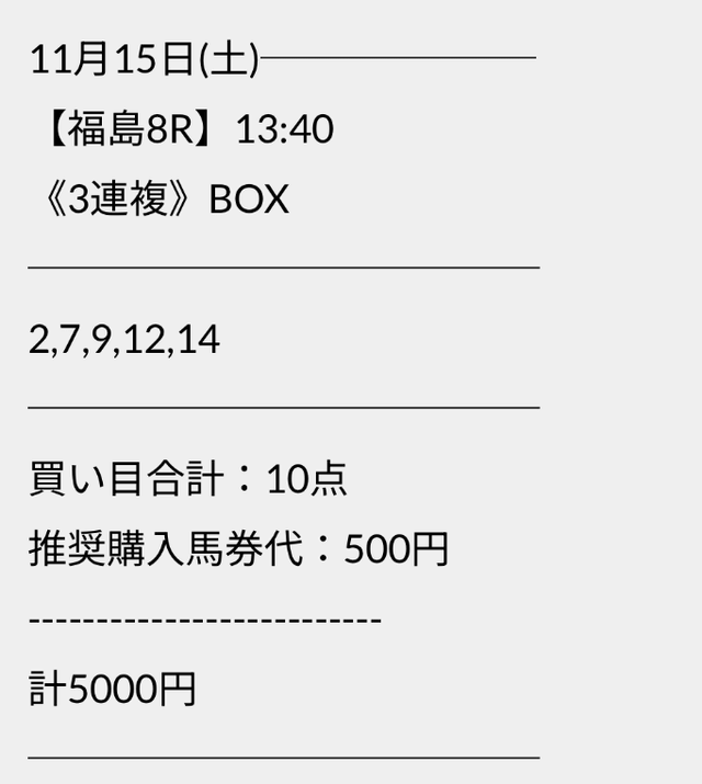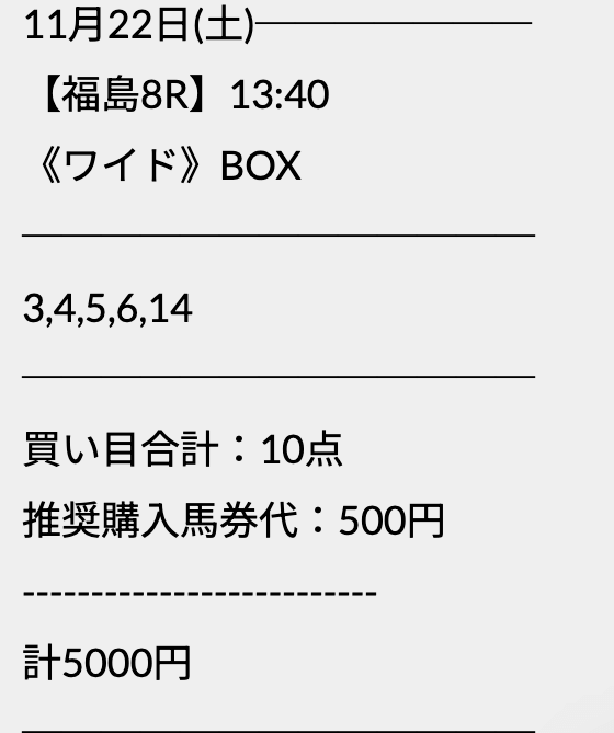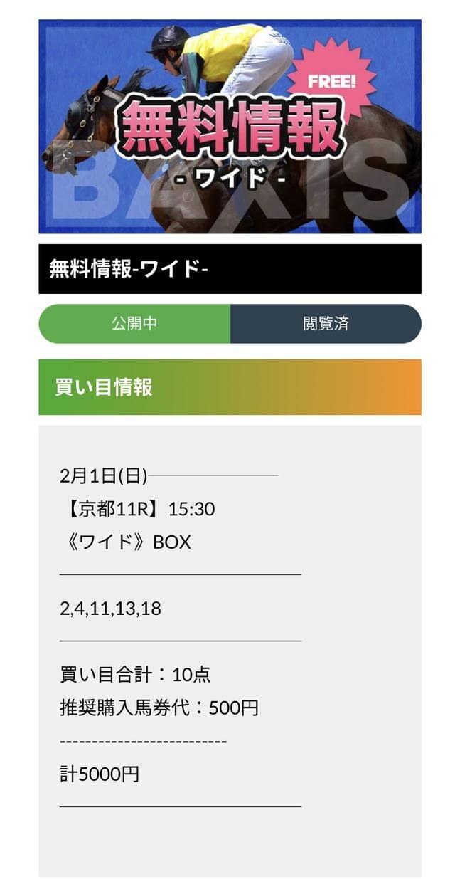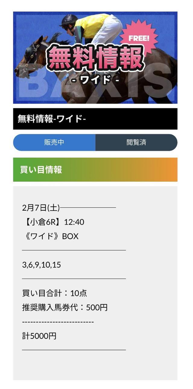 | 毎週末お楽しみ いただく為に | 膨大な軍資金は不要。 無料予想が用意され、有料予想も安価なものを用意。 |