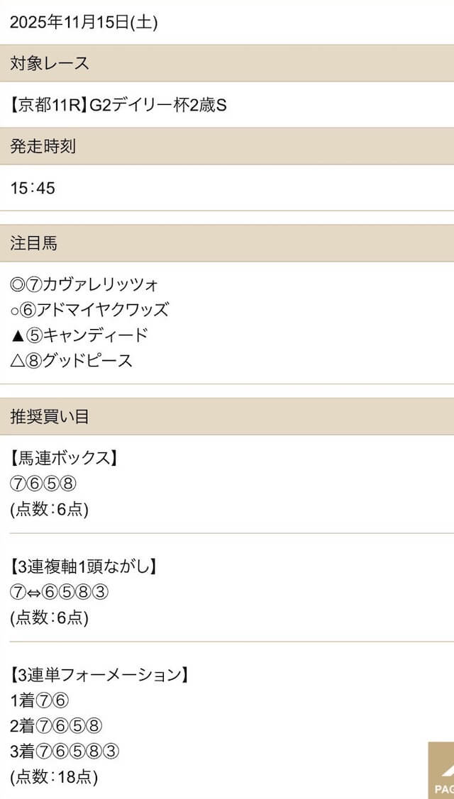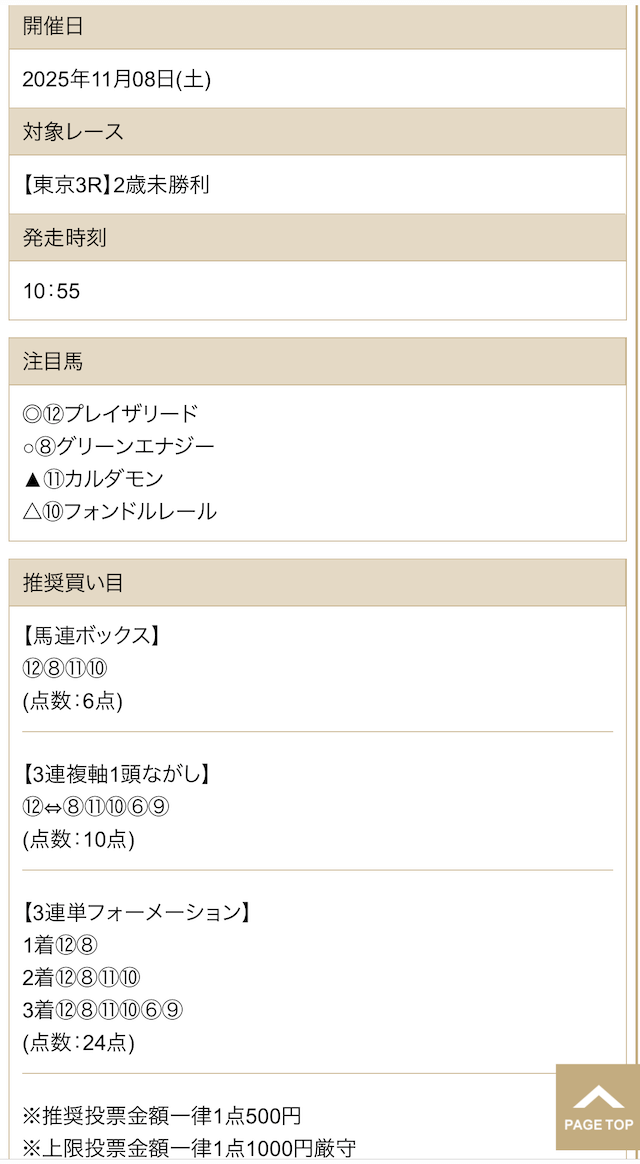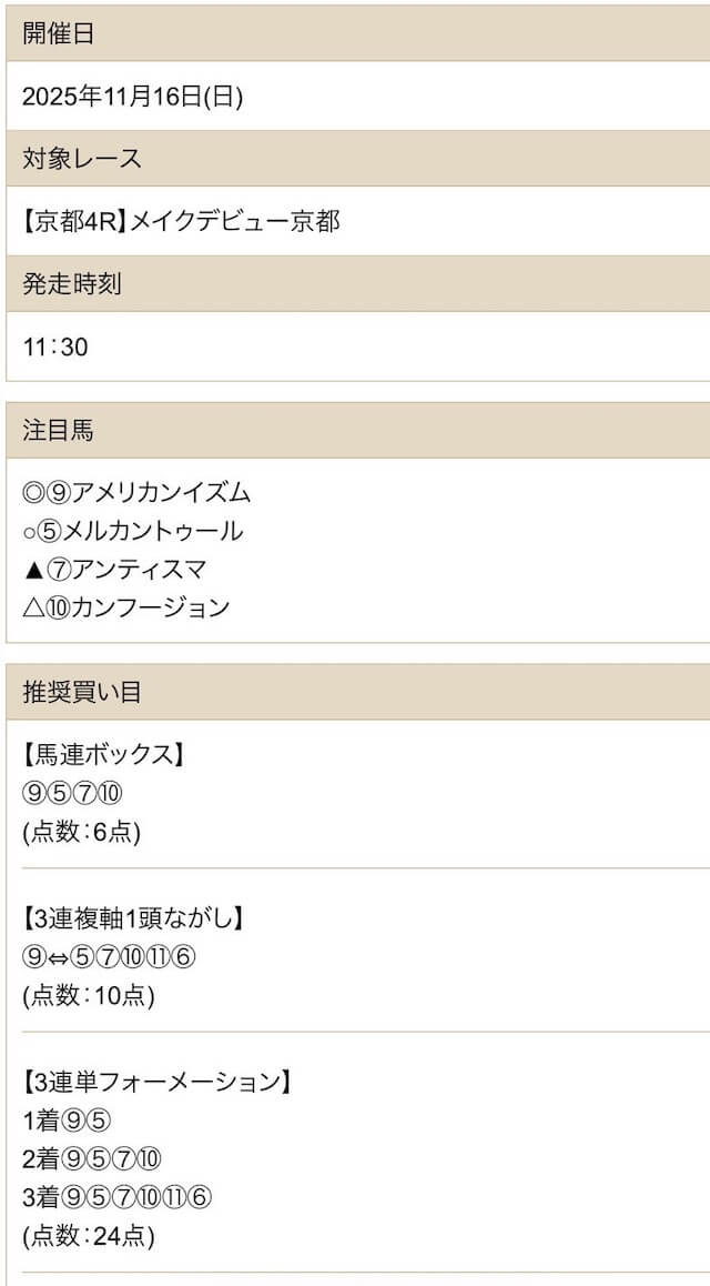 5.0名無しさん30代 男性 職業:◎良い点普通の予想提供だけじゃないよく考えたらこれ印の◎使えば単勝1点予想とか◎◯▲で複勝3点予想とかもできるのでは? 本当に自分に自信あるなら3連単で高配当的中狙いにいくのもいけるし無料予想最強なのでは。 - 2024.10.23