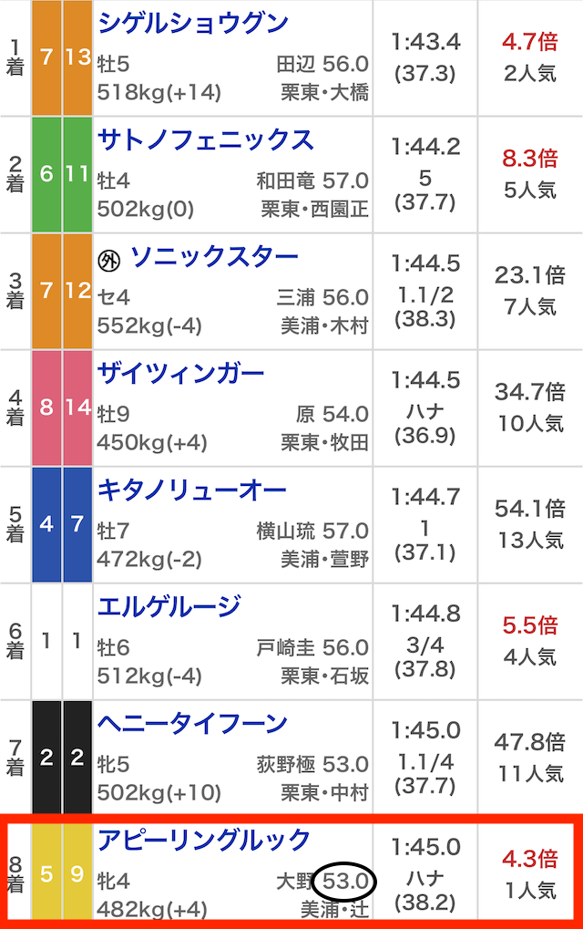 1番人気は3勝クラスからOPの勝ち上がりで、斤量も他の馬と比べて53kgと低いことから人気していたが・・・