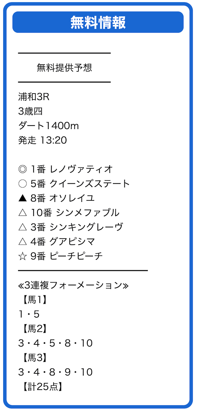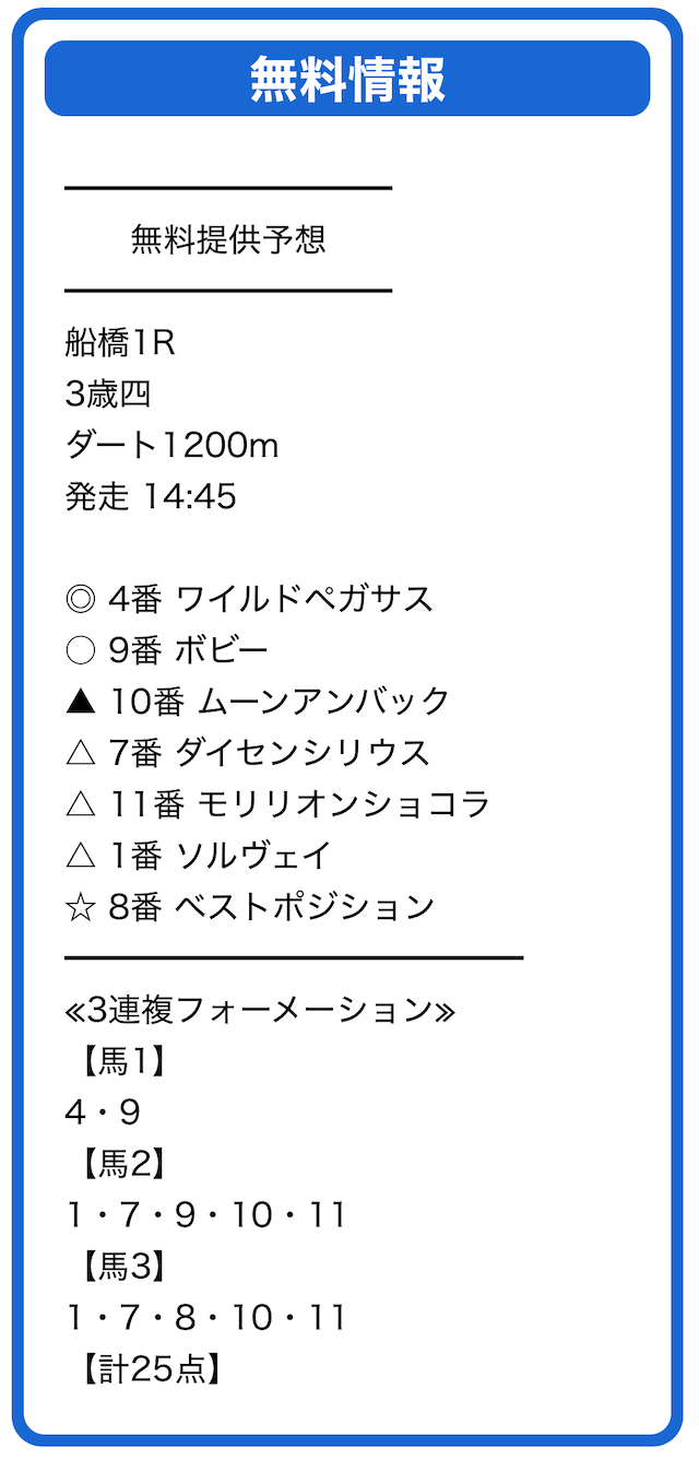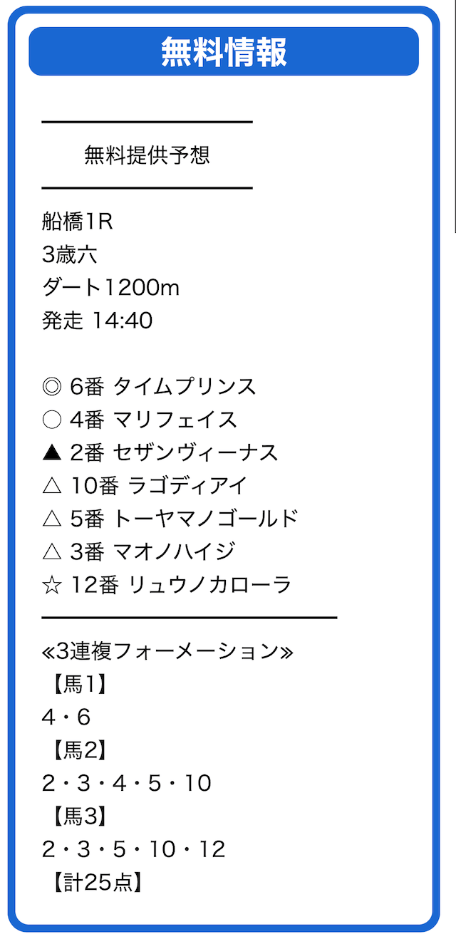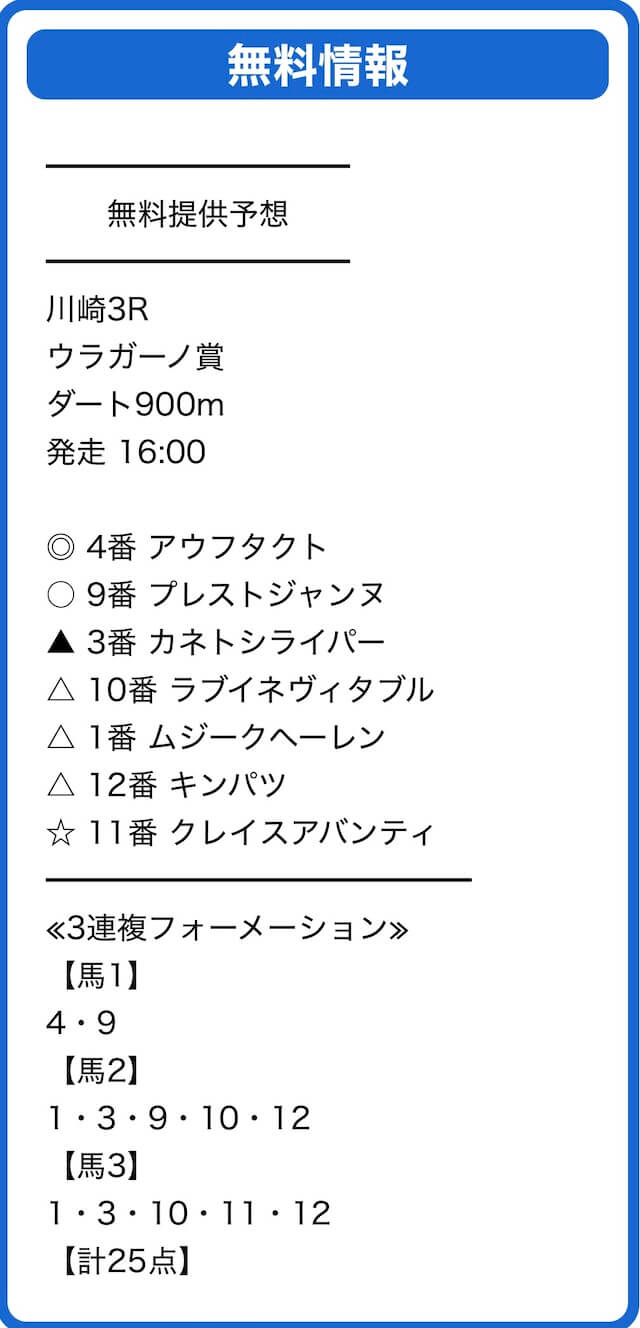 | 買い方 合計投資金額 | 3連複フォーメーション 25点×1,000円=25,000円 |