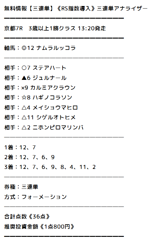 中でも、7番人気は2レース前から調子を上げていることから、まだ好走しない気もしなくはないが、その程度の感覚だ。