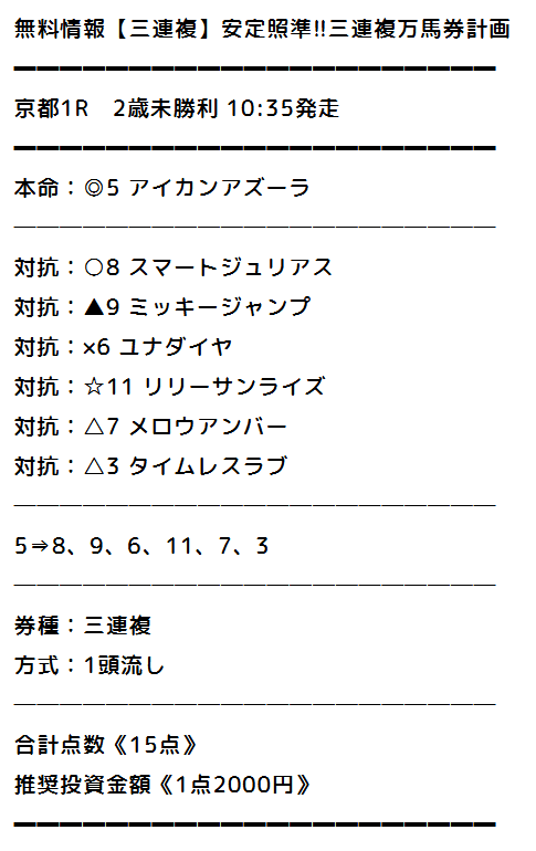 | 三連複万馬券計画 | 1鞍:15,000円 2鞍~6鞍提供 | – | 2,000,000円 – |