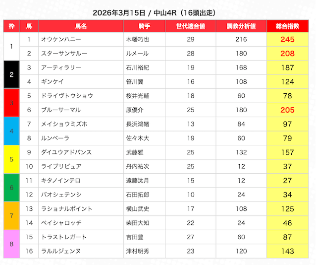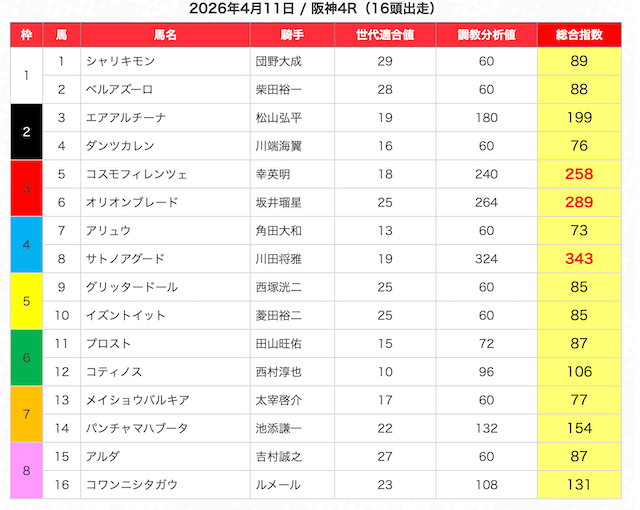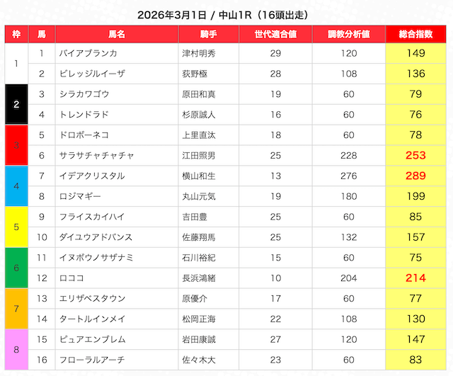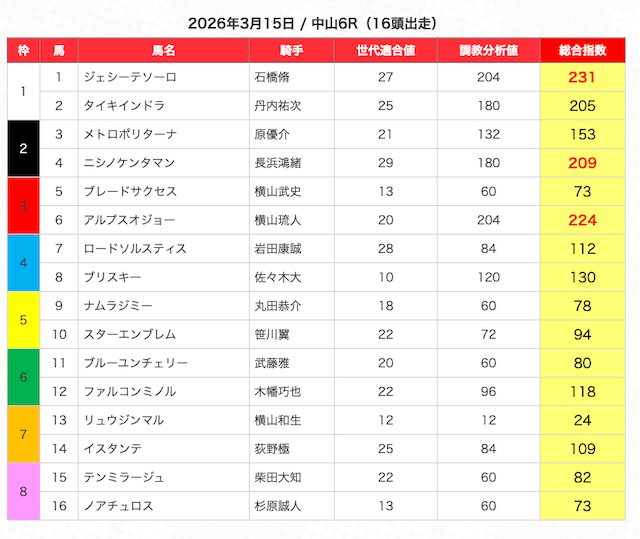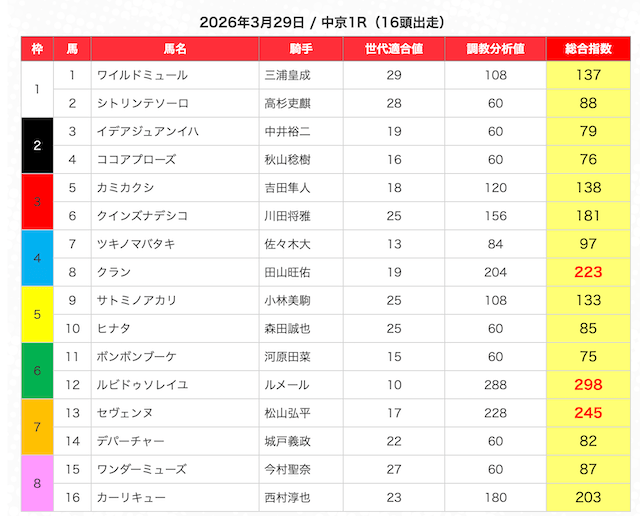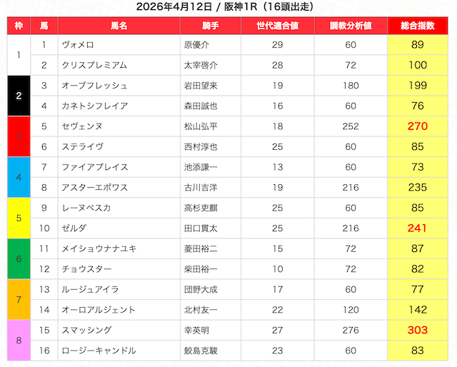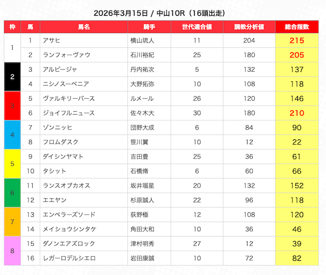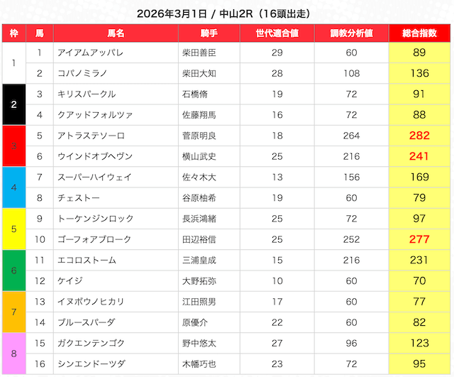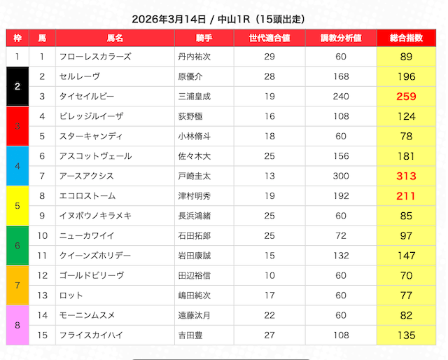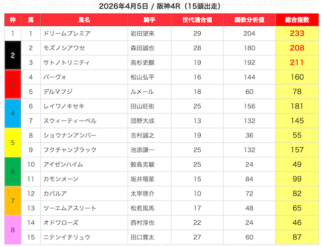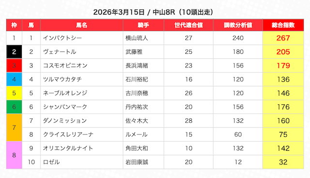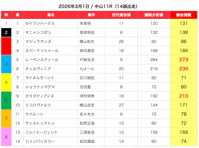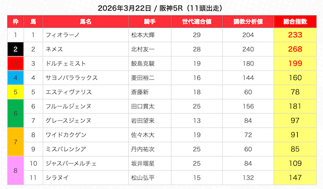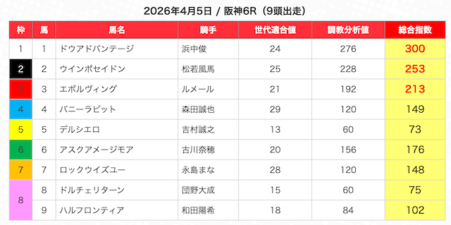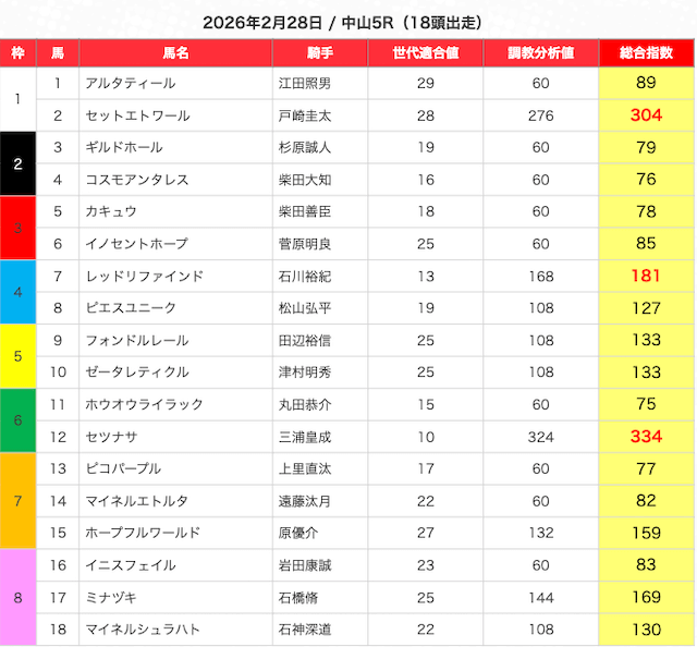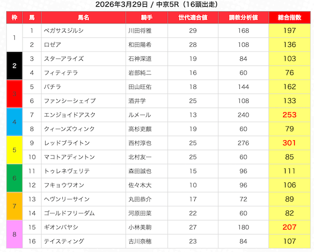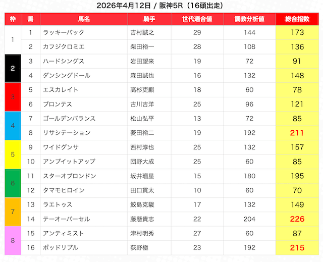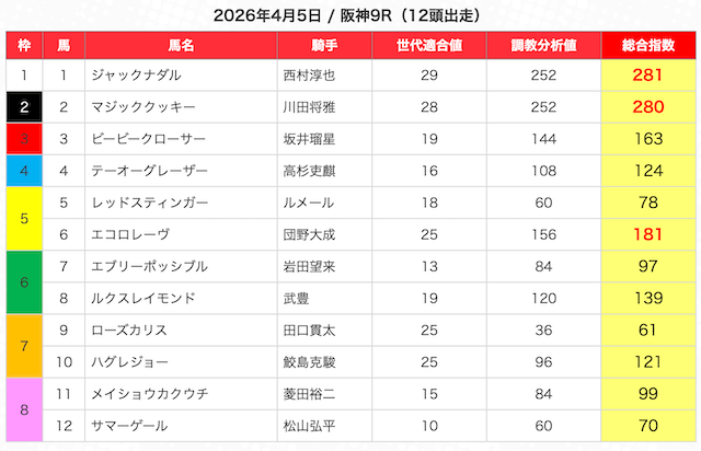 指数が高い順に選んだ5頭の馬は、人気から穴馬まで幅広い。