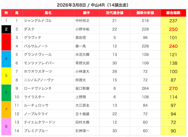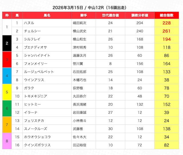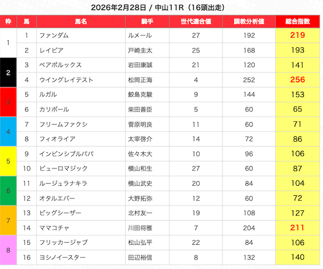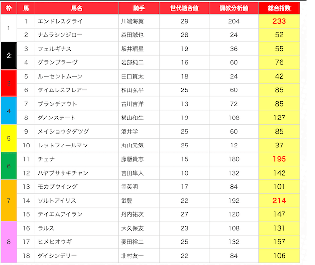 JRAの公式サイトの出走表をもとにまとめうまジェネが選んだ馬はこちら。