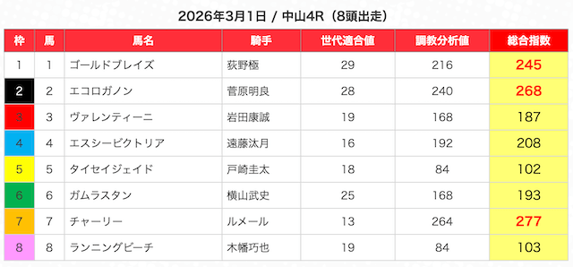 今回競馬口コミダービーは、指数の中で数値の高い5頭をピックアップした。