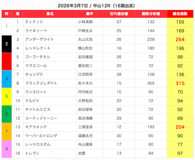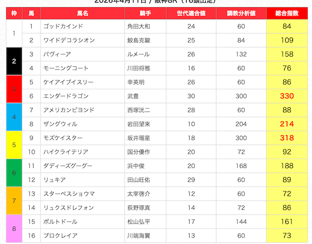うまジェネのAIで一番数値が高かったのは、1番人気の⑧ゲッティヴィラ。