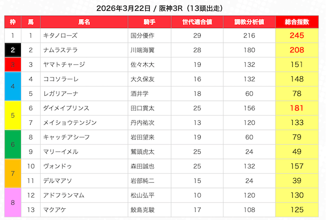 | 5 | 10 | キタノソワレ (指数第3位) |