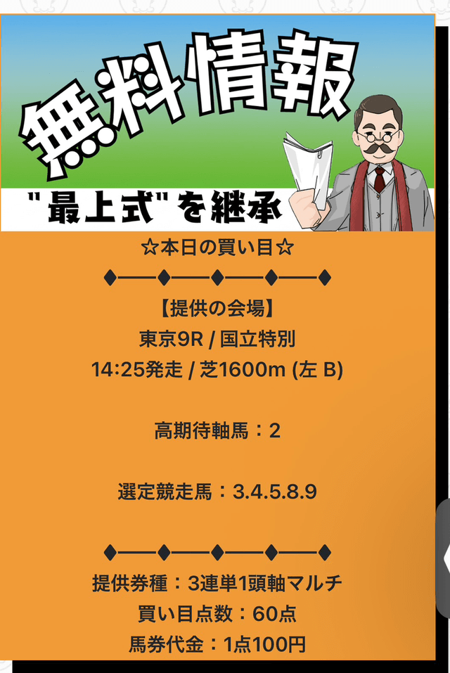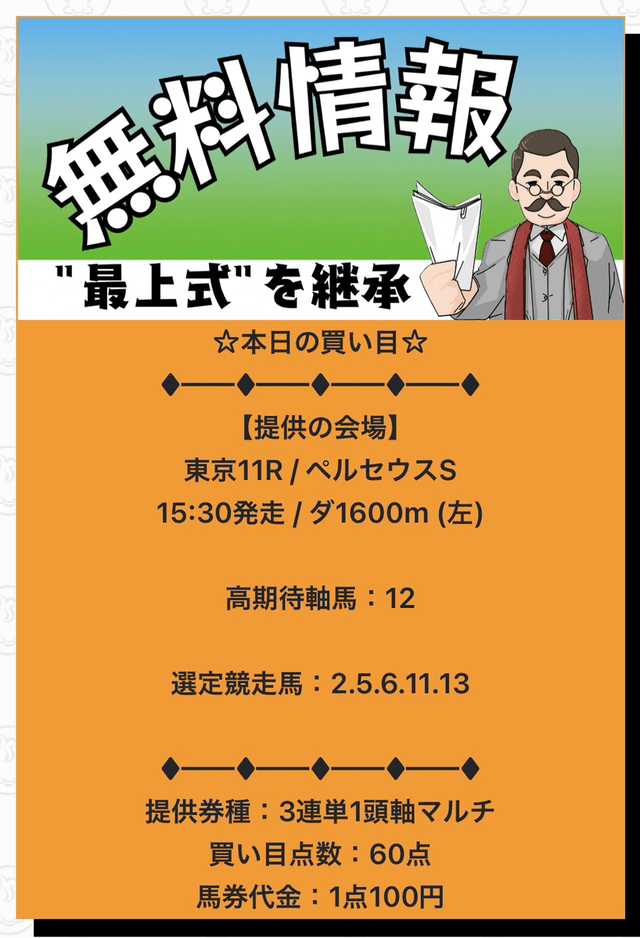 5.0匿名さん50代 男性 職業:◎良い点無料情報に馬券代を投じるなら1万円以下のプランに参加する事をおススメするww だって馬券代と同じくらいでプラン参加出来て2レースあるって考えたらどう見ても当たりやすいのはプランでしょう。 - 2025.11.19