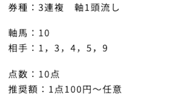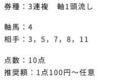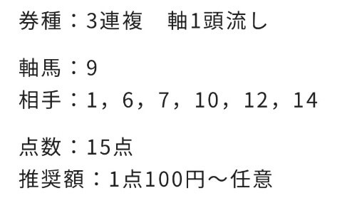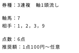 | 3連複 | 3-4-9 | 14.1 | 2 | 的中 |