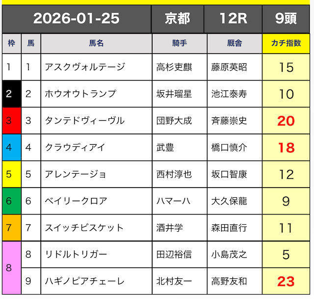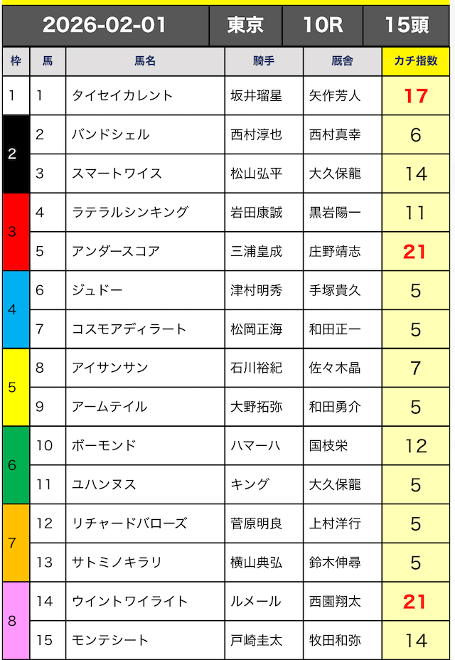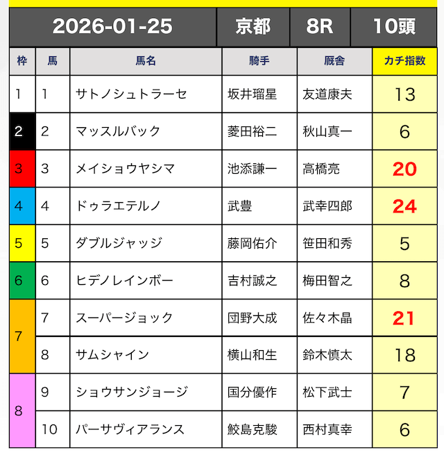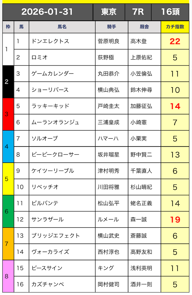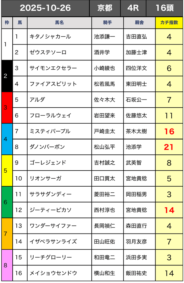 それではいきなり結果を見る前に、カチケンがこのレースでどんな馬を選んでいるのかを確認してみよう。