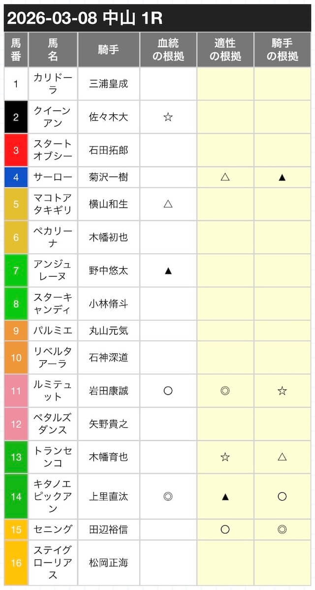 | 走破方程式β | (基礎能力×展開順応×調教反映)+騎手補正 走破力を決定する。 |