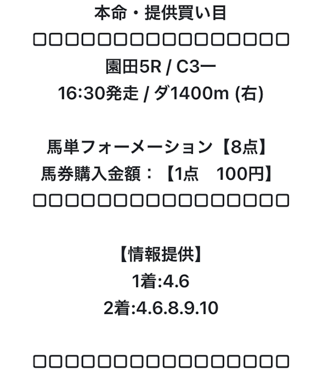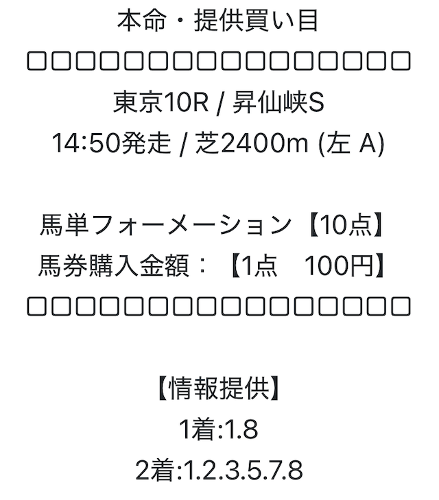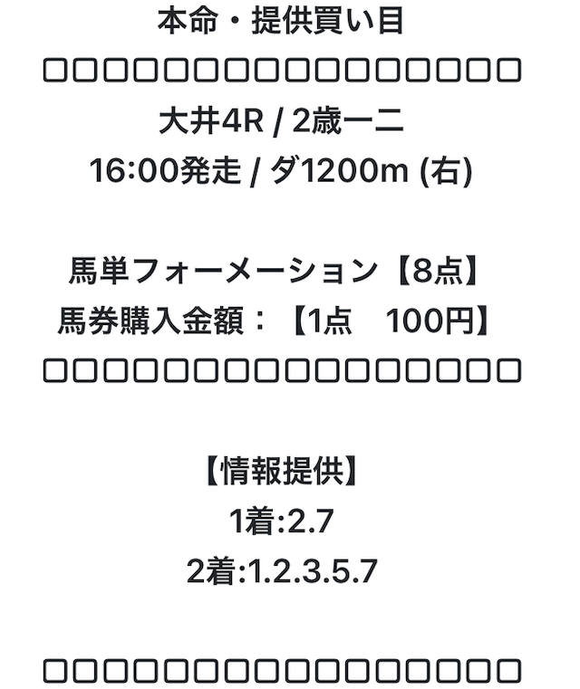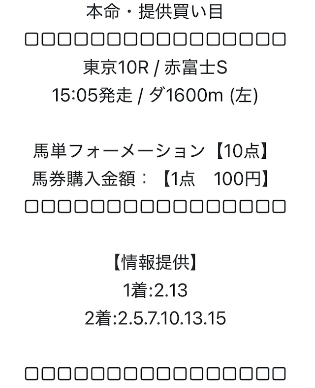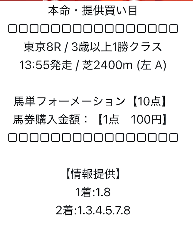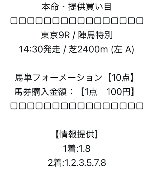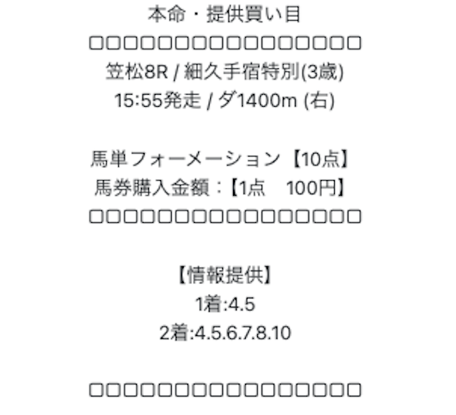 4.0名無しさん40代 男性 職業:◎良い点経験者目線これぞ競馬だろって感じのいい感じの配当もたまにある良い無料予想。 日和ってるところも見えるのは保身と見るか、戦略的だと見るかで人によってそこは変わりそうかなと。 競馬やってる人から見て悪くは決してない。