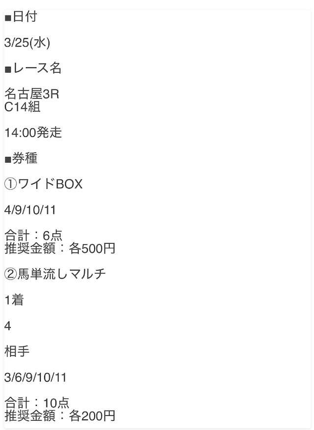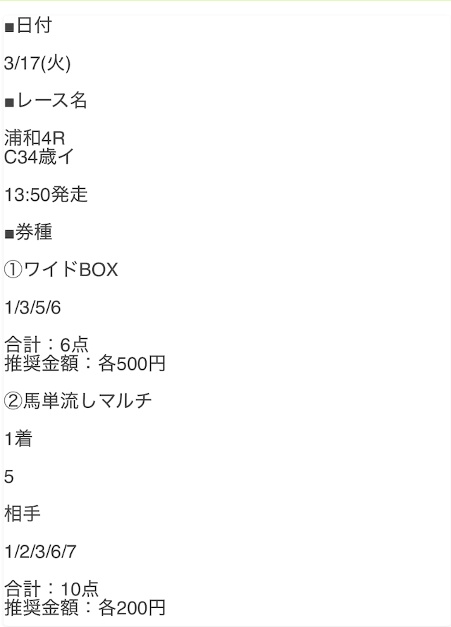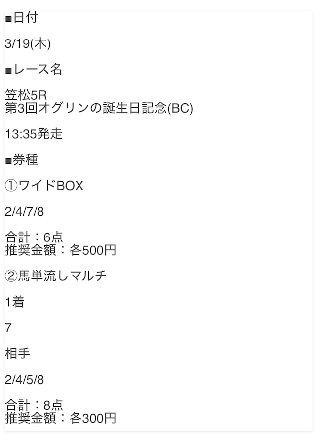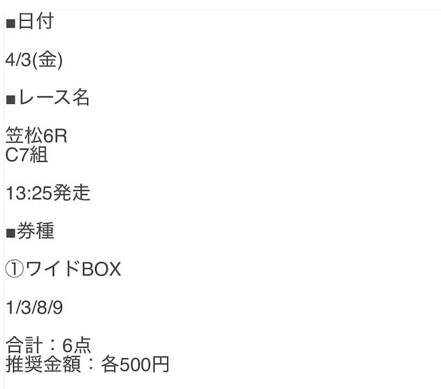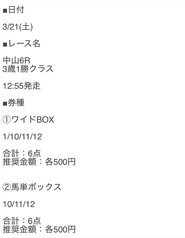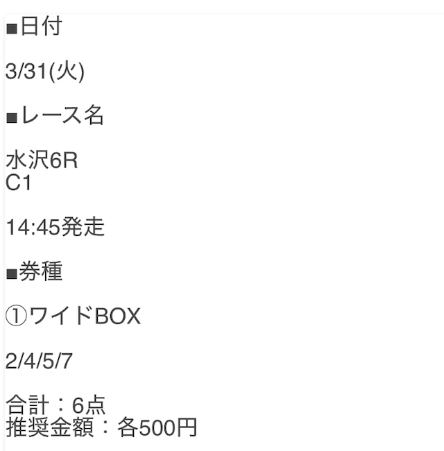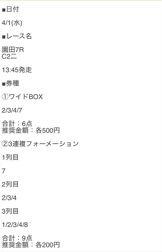 2.0名無しさん30代 男性 職業:✕ 悪い点参加したいレースの提供がなかった今回だけの可能性もあるけど、買い目の提供がなくてに参加できなかった。地方予想で軍資金集めしてたのに。