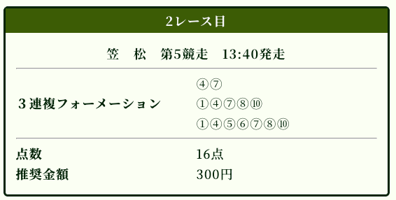 3連複 | 1-5-7 | 28.5 | 8 | 的中 |
