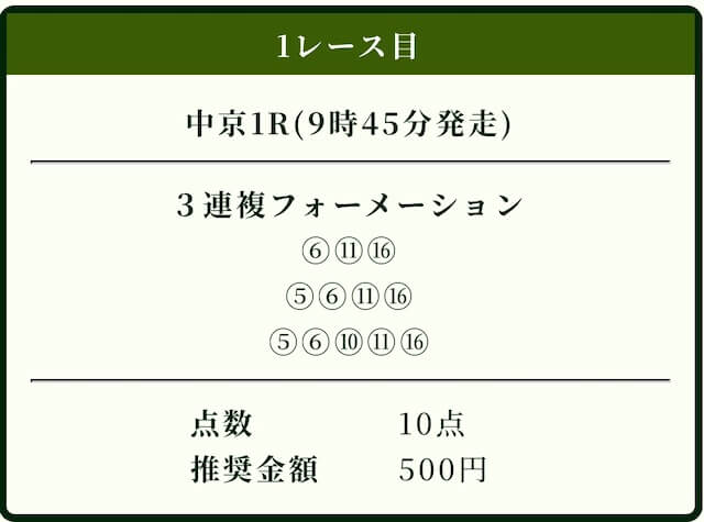 | 3連複 | 1-6-10 | 14.3 | 9 | 的中 |