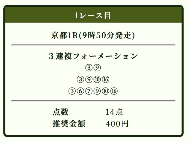 - 2025.01.152.0名無しさん30代 男性 職業:✕ 悪い点点数が多い時がある3連単で点数が30点あるのは別に構わないけど、3連複で30点の予想はちょっとな。