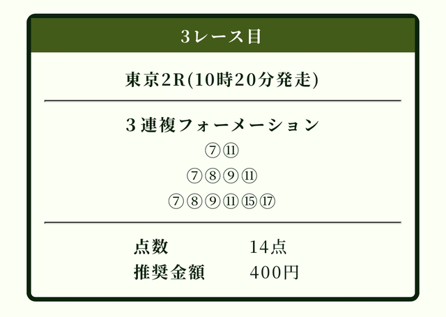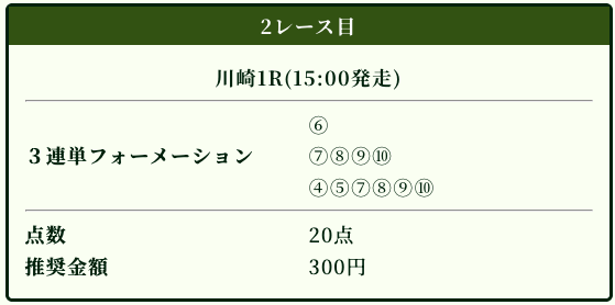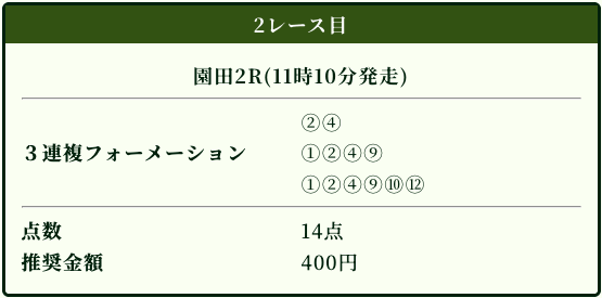 | 3連複 | 2-7-8 | 14.5 | 5 | 的中 |