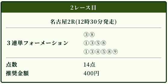 | 3連複 | 2-3-8 | 14.5 | 2 | 不的中 |