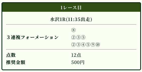 | 3連複 | 5-7-8 | 35.6 | 13 | 不的中 |