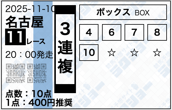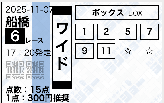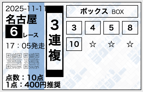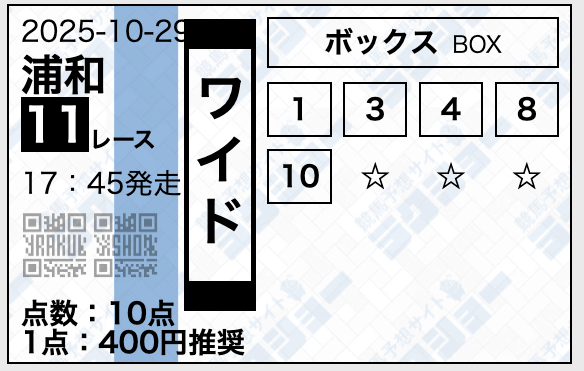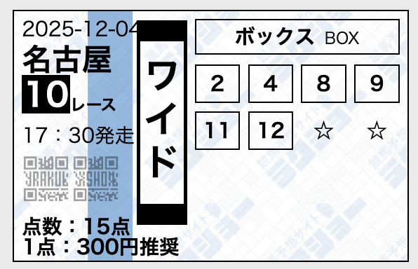 4.0名無しさん30代 男性 職業:◎良い点感触は良いが3連複よりはワイドって感じかな。 ちょっとまだわからないけど、提供している形式も3連複よりワイドの方が多いからワイドの方が無料予想だと良い? けど3連複で出してる時の買い目だいぶ勝負に出てる感じもあるから悩みどころ。 - 2025.01.9