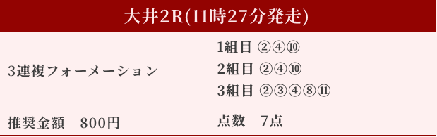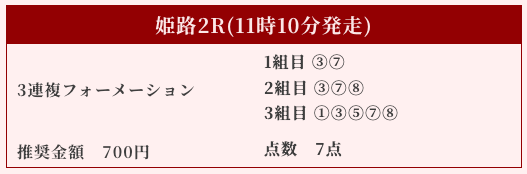 | 3連複 | 2-7-11 | 7.5 | 2 | 的中 |