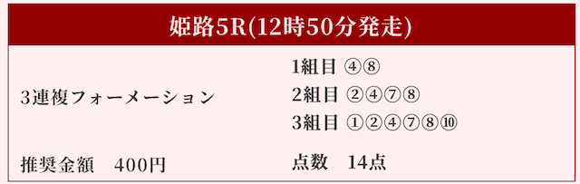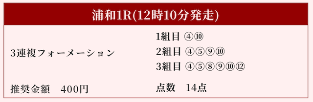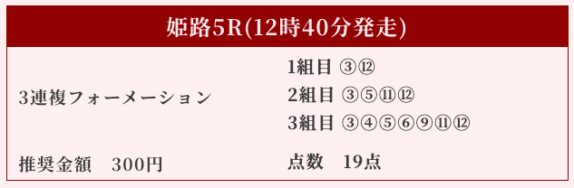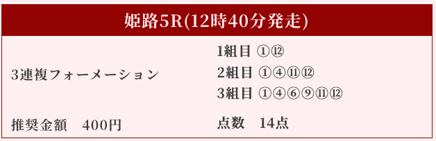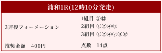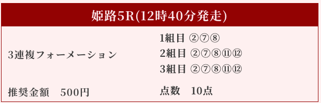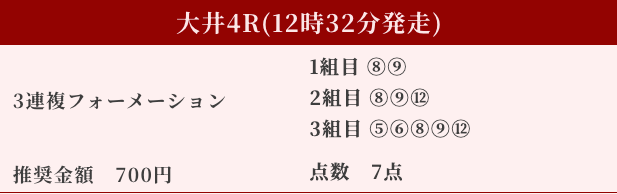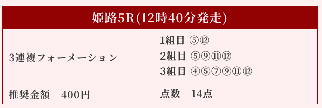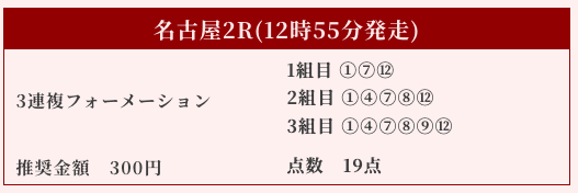 | 3連複 | 4-7-12 | 5.8 | 1 | 的中 |