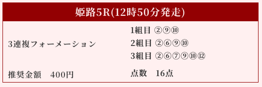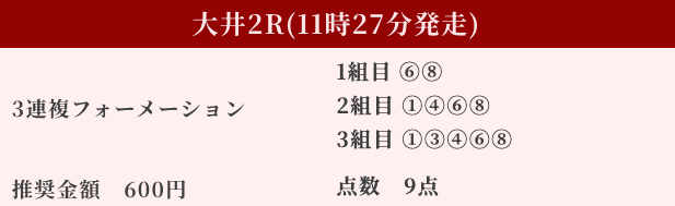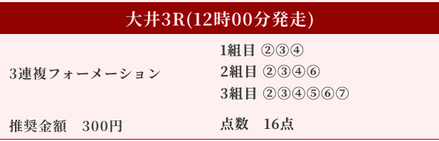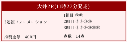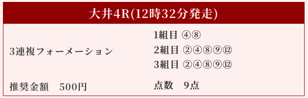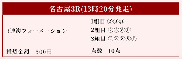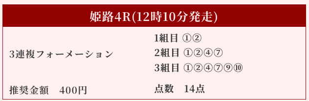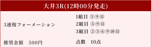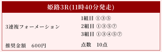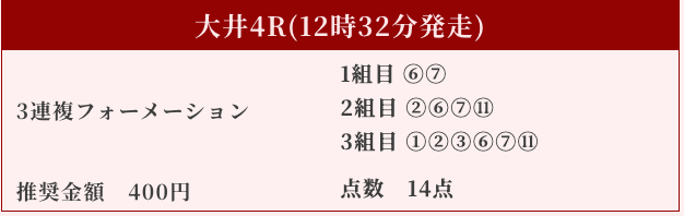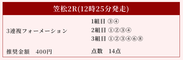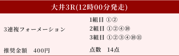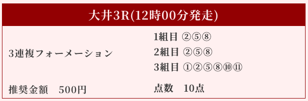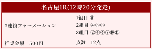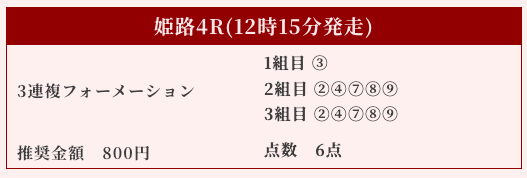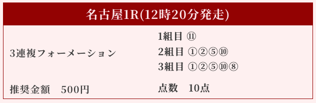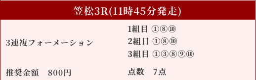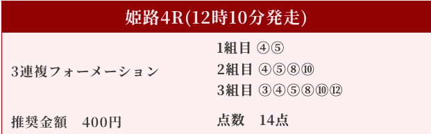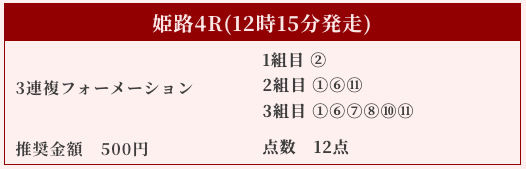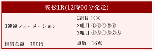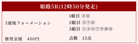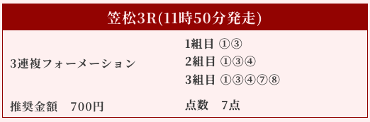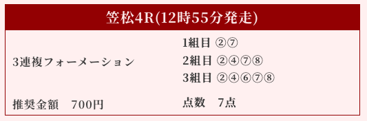 | 3連複 | 4-8-11 | 16.7 | 3 | 的中 |