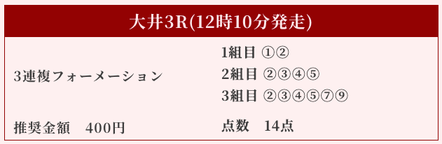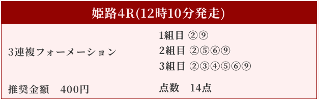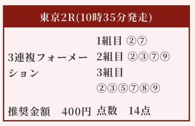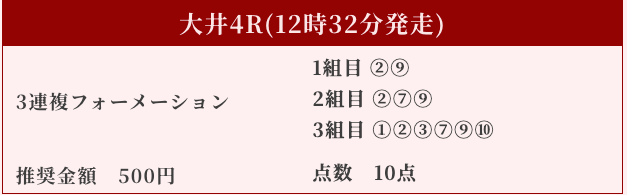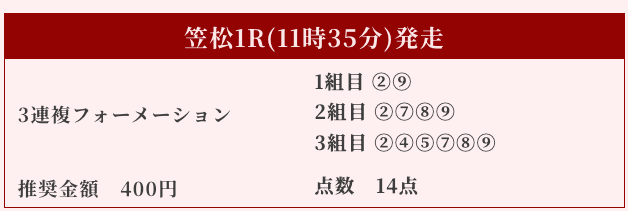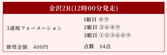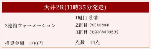 | 3連複 | 2-4-9 | 11.9 | 2 | 的中 |