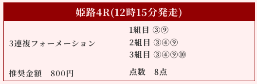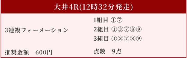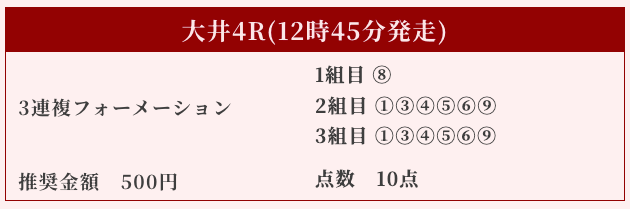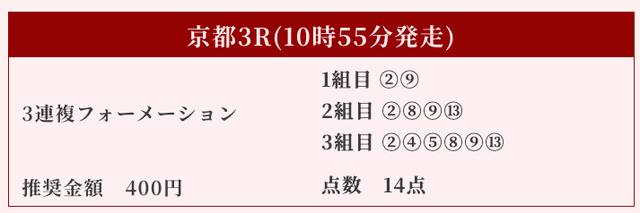| 3連複 | 1-4-9 | 26.8 | 10 | 的中 |