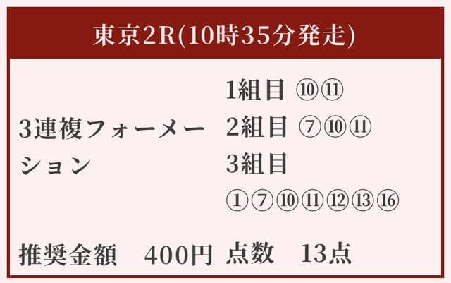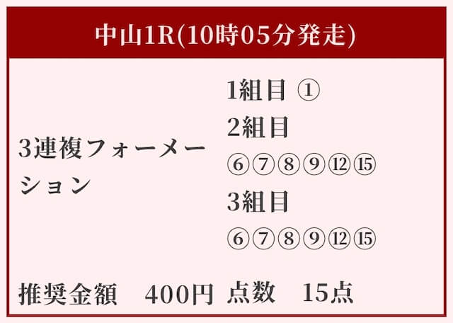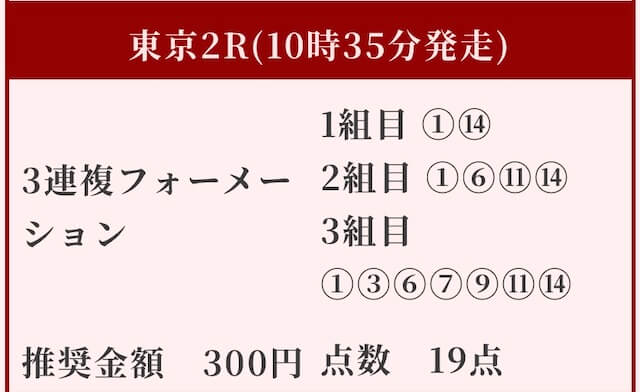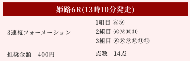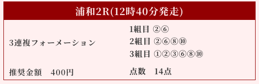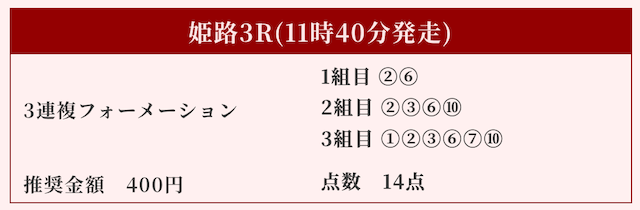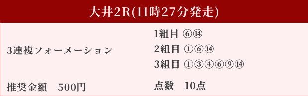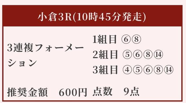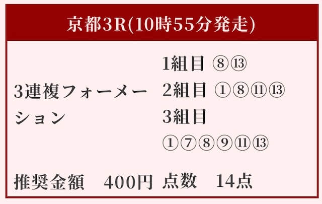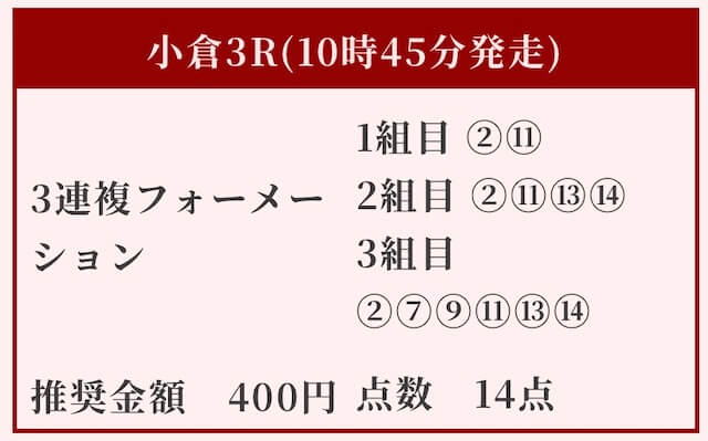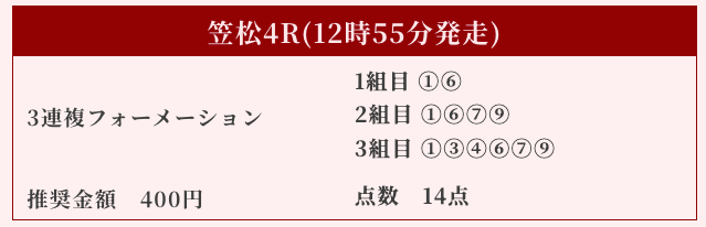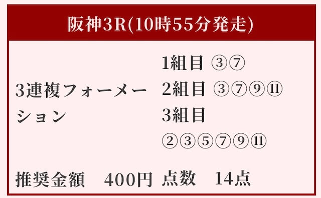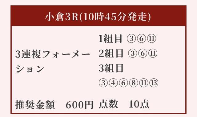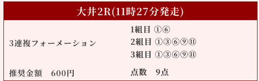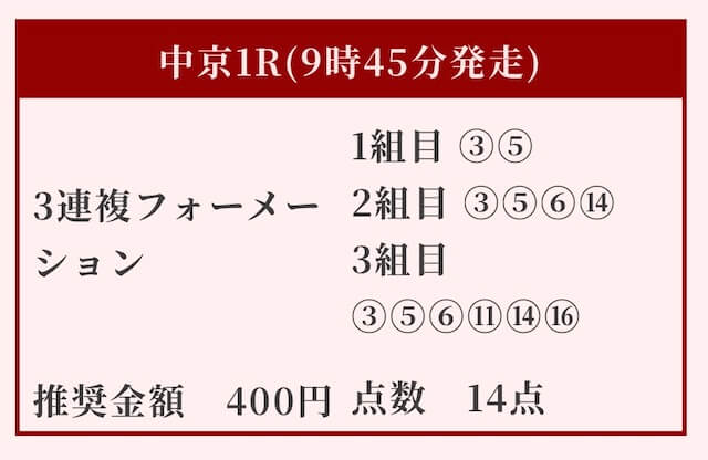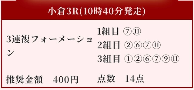 | 3連複 | 1-4-6 | 11 | 3 | 的中 |