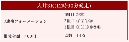 | 3連複 | 9-10-12 | 38.3 | 13 | 不的中 |