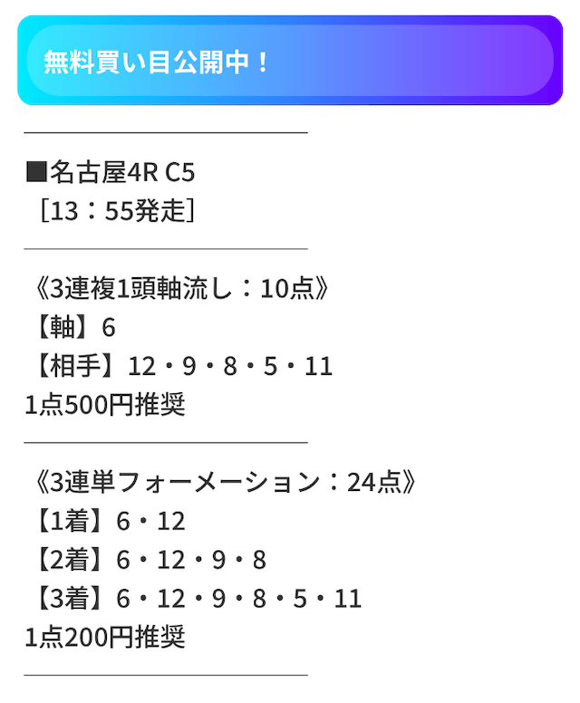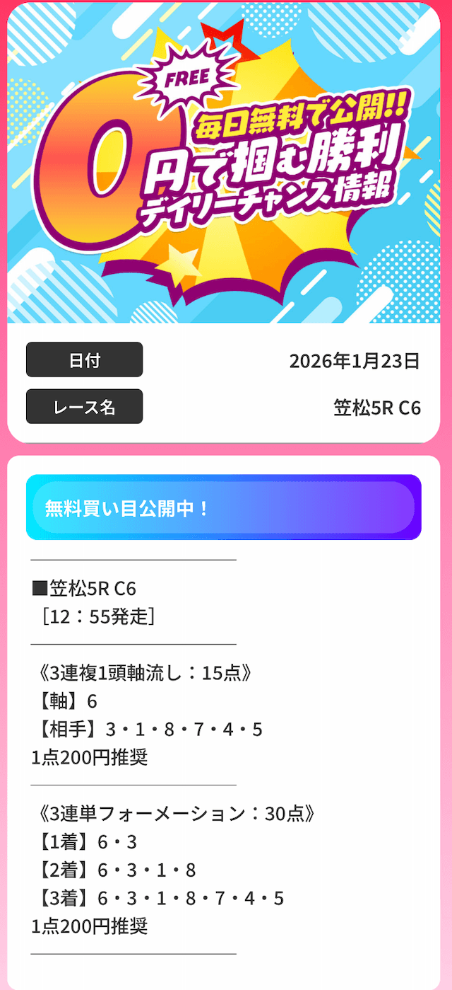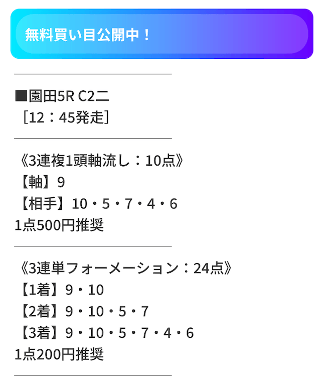 ただ、3連複・3連単を同時に当てる買い目を無料で提供しているサイトはあまり見かけないことを考えると、的中につなげ高額な払い戻しをたまにでも受け取れているのなら、そこまで悪く思う必要はないのだろう。