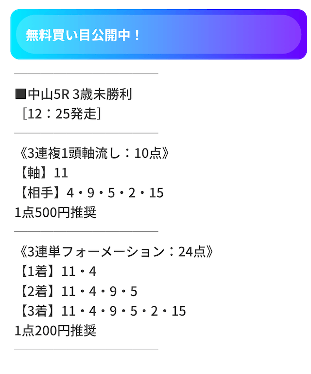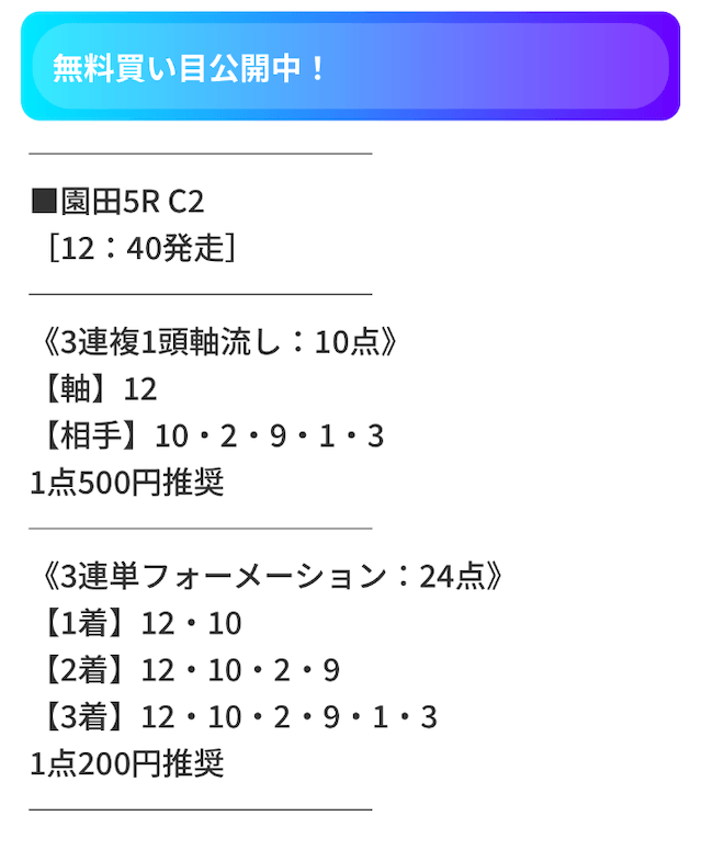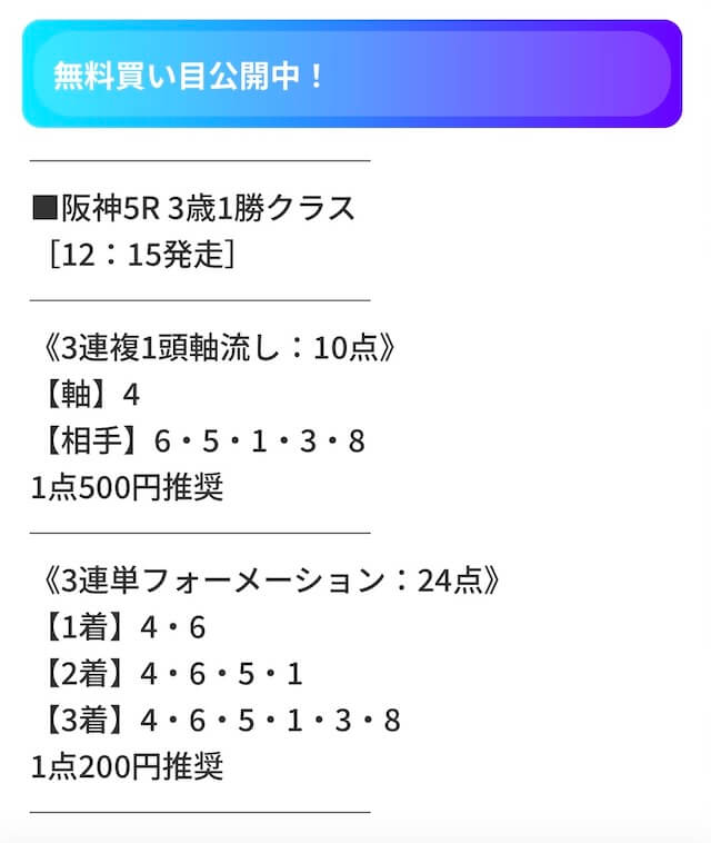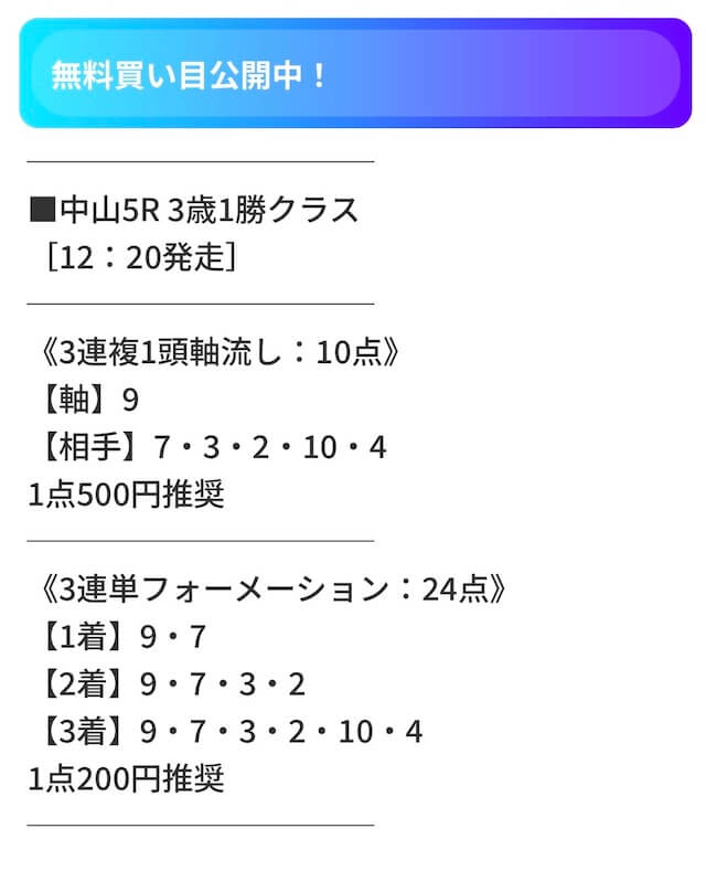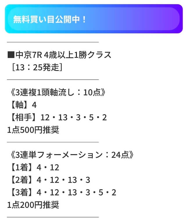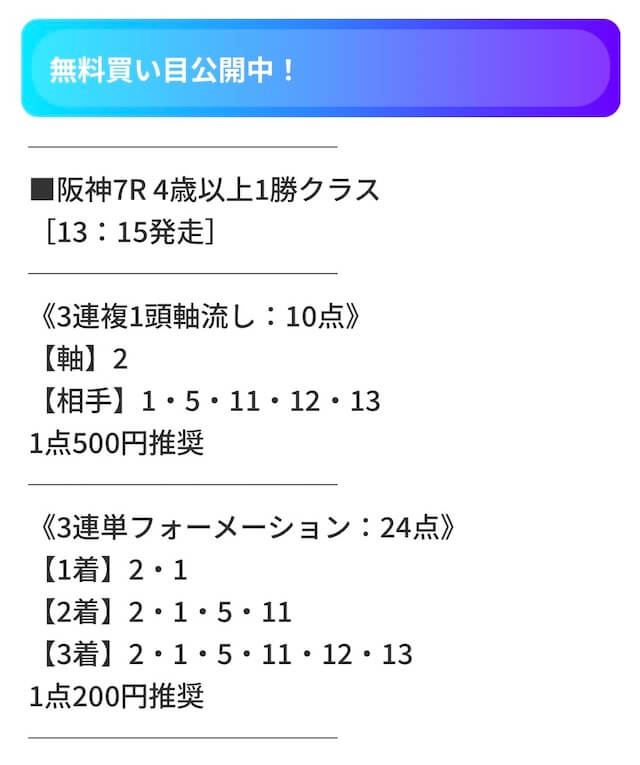 そのため、有料予想との比較がしやすく、目に見えて点数や払い戻しに違いがあり、「無料」はあくまでお試し、メインは有料予想を使って欲しいという思いなのだろう。
