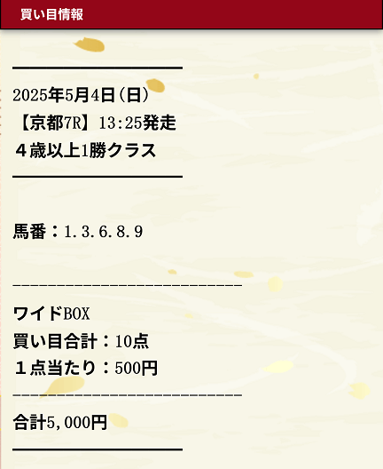 | ワイド | 7-9 | 4.8 | 7 | 的中 |