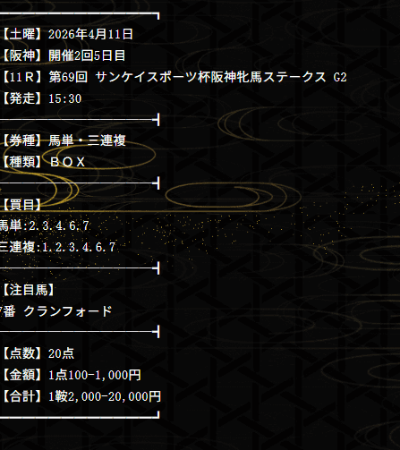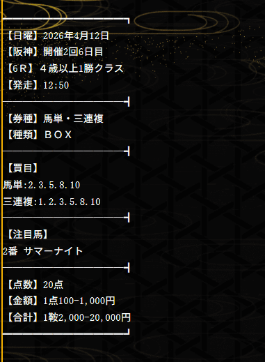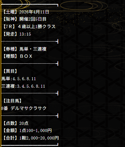 | 戦歴 | 24戦12勝10敗 2トリガミ ⇒検証記事 |