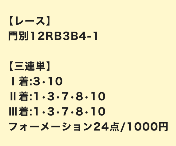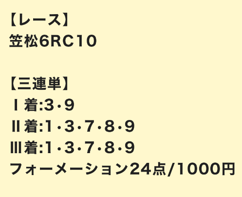 | 3連単 | 8-3-10 | 6747.5 | 909 | 不的中 |