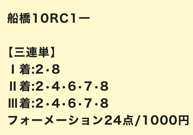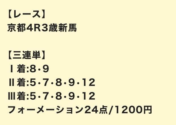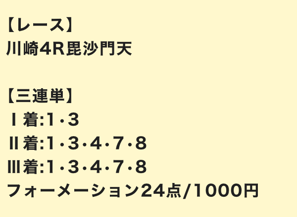 | 3連単 | 4-5-8 | 12 | 8 | 不的中 |