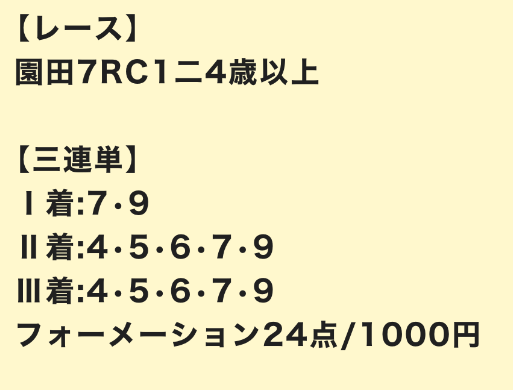 | 3連単 | 9-5-17 | 301.8 | 105 | 的中 |