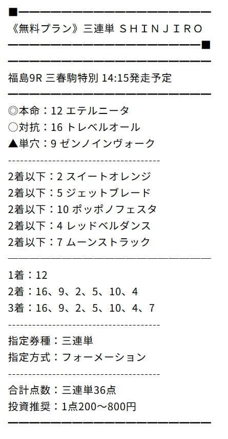 | 馬連 | 3-4 | 33 | 9 | 的中 |
