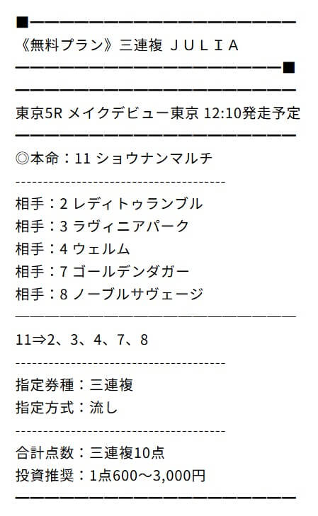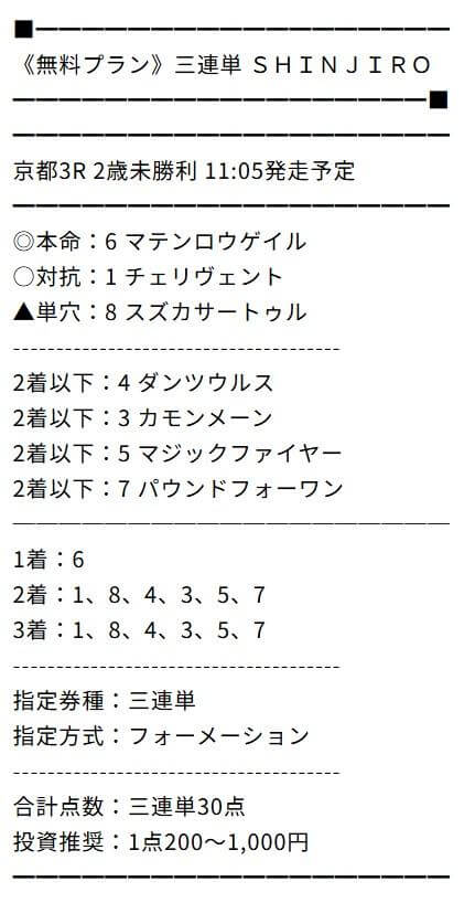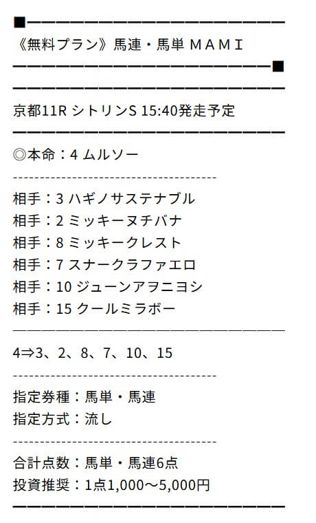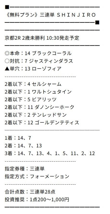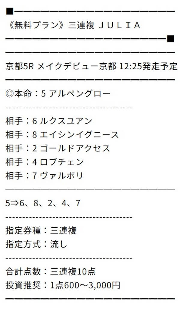 5.0匿名さん30代 男性 職業:◎良い点自分は堅実派ですが、それでも今回の1点は無視できませんでした。 とくに土曜京都6Rの169万は衝撃。不的中も当然あるけれど、総合的に考えれば十分すぎる成果。的中の質が違います。 - 2025.11.16