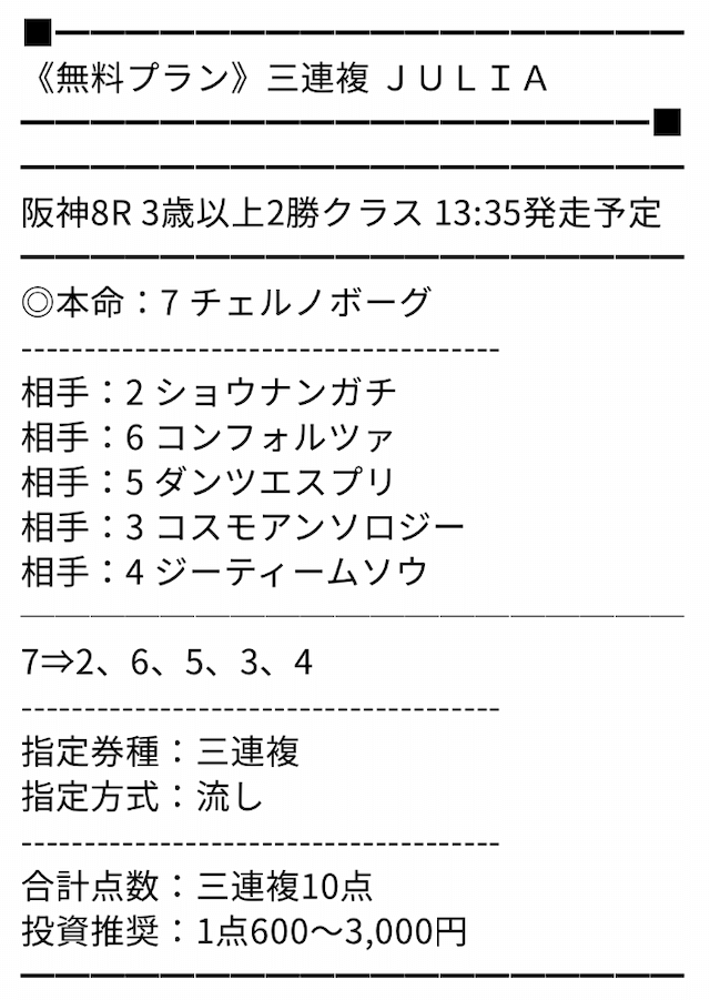 | 馬連 | 6-10 | 39.6 | 13 | 的中 |