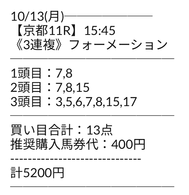 | ワイド | 13-16 | 7.4 | 10 | 不的中 |