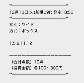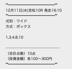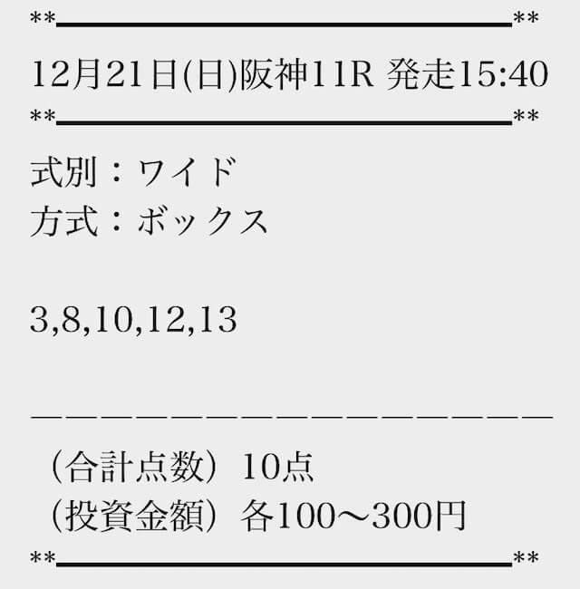 | ワイド | 10-12 | 5.6 | 8 | 的中 |