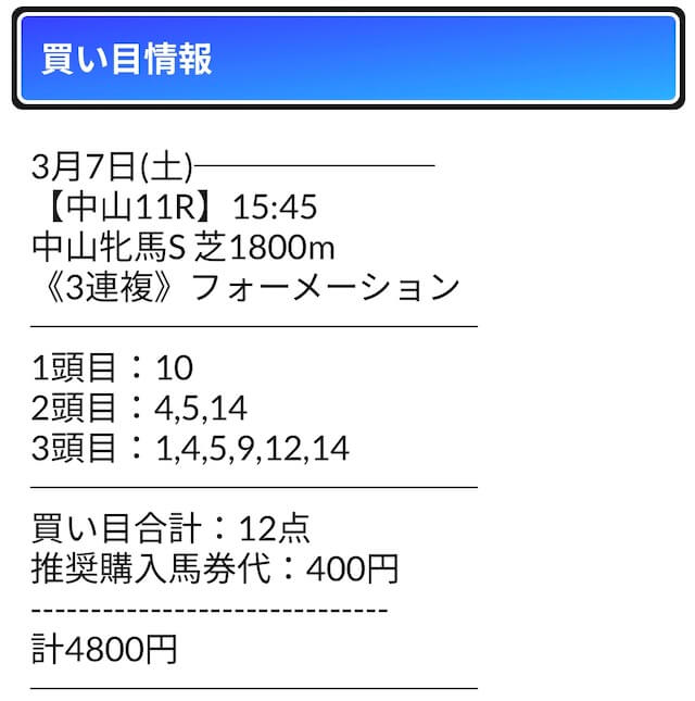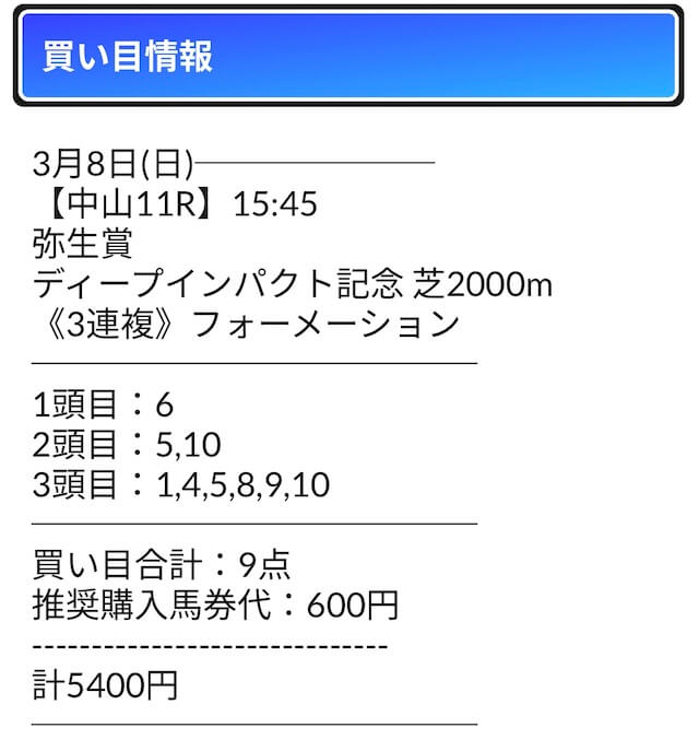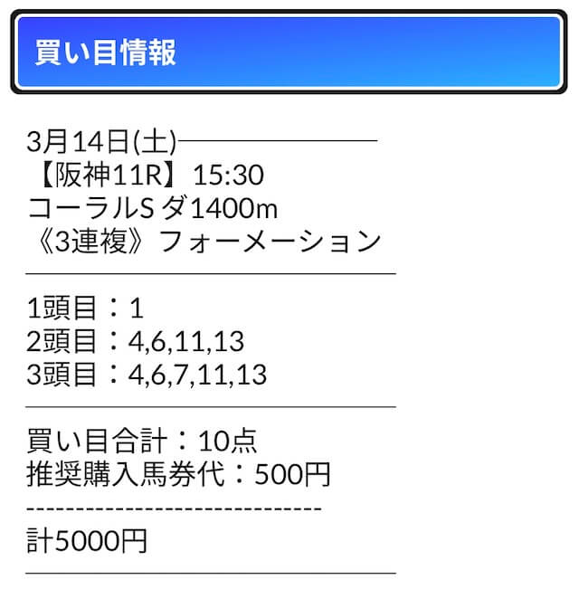 3.0名無しさん20代 男性 職業:◎良い点コスパ◯今まで予想を見たレースは3連複の10点だった。推奨されてされているのは1点500円だけど、これ1点100円にしたら1,000円でいけるんじゃない? 普通に馬券代抑えてで使えるじゃん。 - 2023.06.11